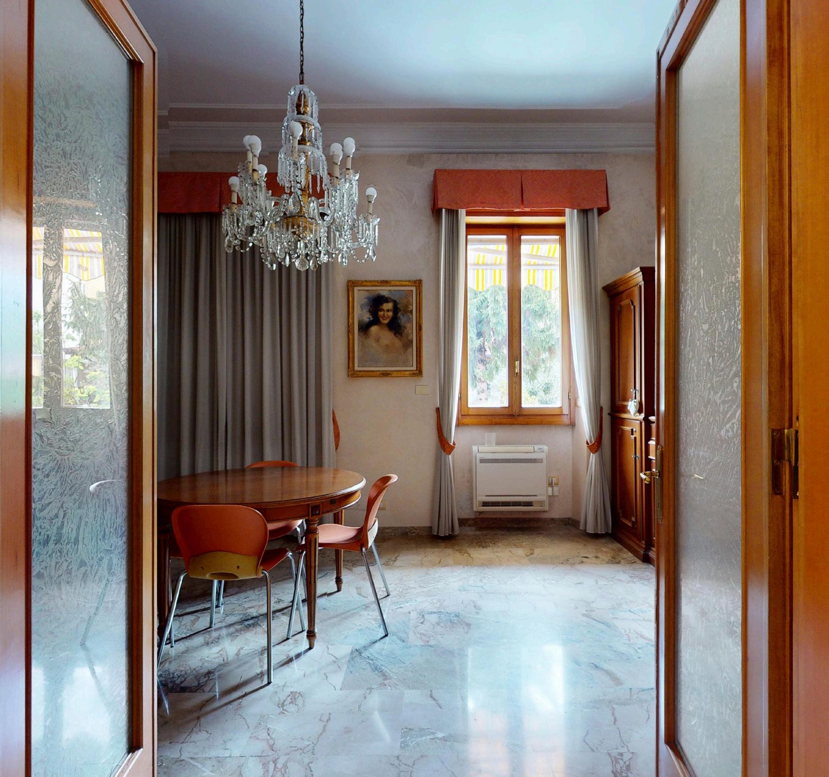 Adiacente al salone e direttamente collegata al terrazzo, la sala da pranzo è uno spazio che invita alla condivisione, al pranzo allargato, alla cena all’aperto. Le dimensioni generose e l’affaccio riservato ne fanno un ambiente fluido, facilmente trasformabile. L’accesso diretto all’esterno permette di moltiplicare le occasioni d’uso e godere appieno della stagione mite. Un ambiente di passaggio che diventa centrale.