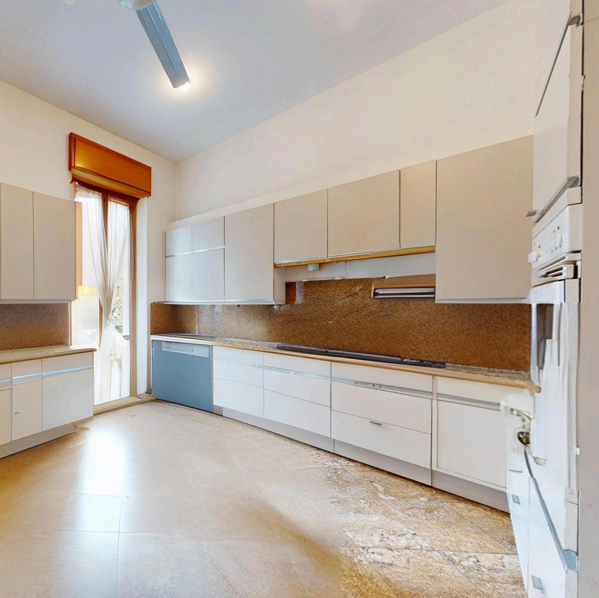 Separata, abitabile, solida: la cucina si affaccia anch’essa sul terrazzo, con una configurazione che privilegia la funzionalità senza sacrificare la luce. L’attuale disposizione lascia ampio margine di reinterpretazione, per chi desidera integrare soluzioni su misura, isole operative, zone colazione o superfici tecniche. È uno spazio concreto, da pensare in relazione al verde e alla famiglia.
