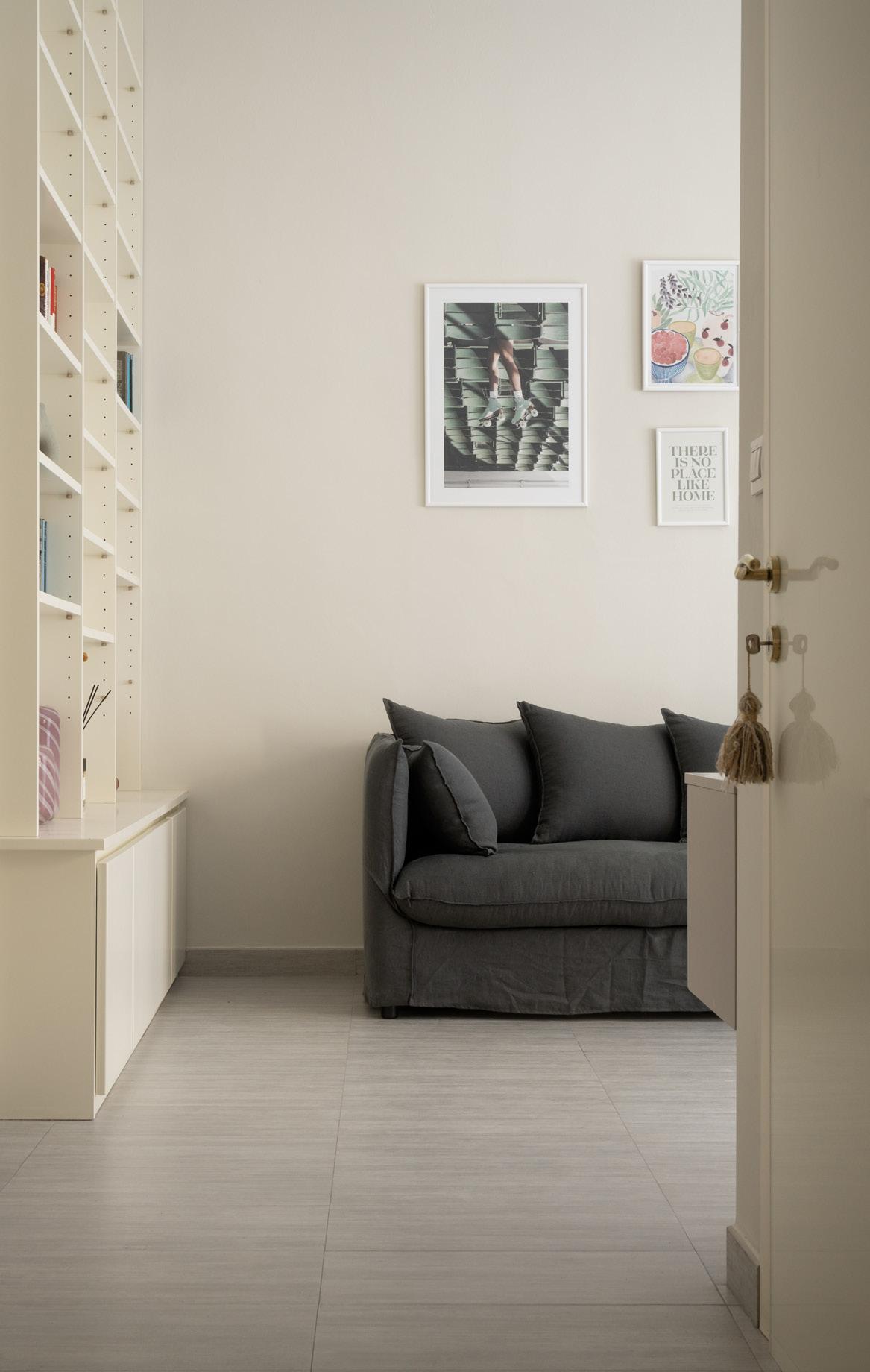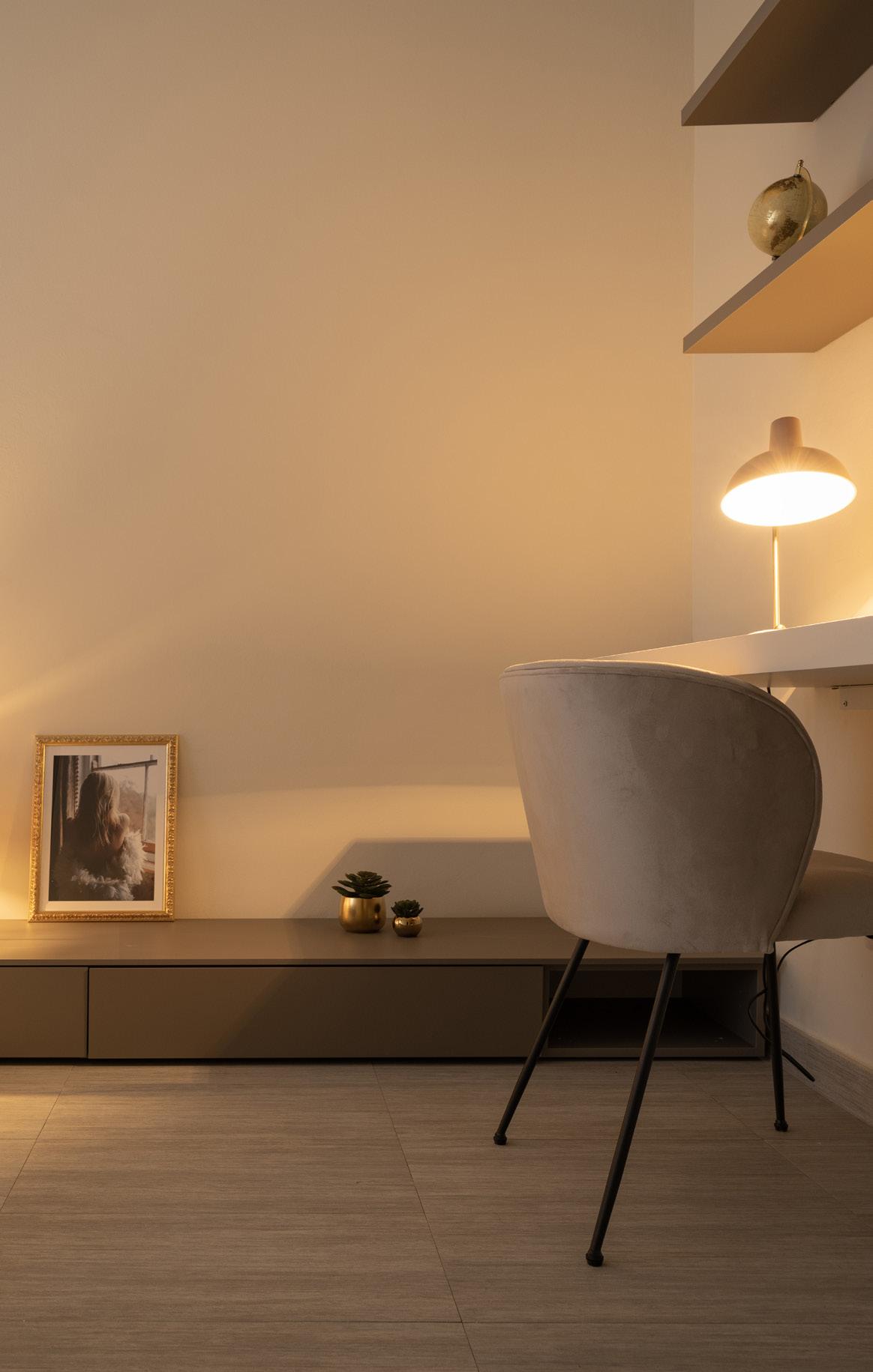 Il soggiorno si apre come ambiente principale, luminoso e regolare nelle forme. Le pareti neutre dialogano con il parquet caldo, creando un’atmosfera accogliente e discreta. È uno spazio versatile che può ospitare tanto i momenti di relax quanto la convivialità, con una naturale continuità verso la cucina.