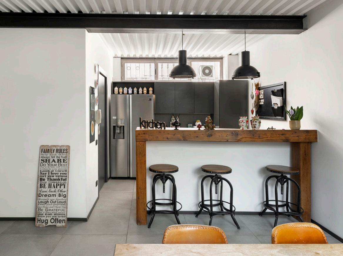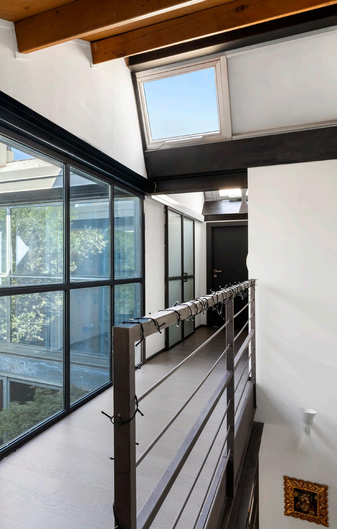 Sempre al piano terra troviamo la cucina, ben separata ma visibile dalla zona giorno, un locale lavanderia e un ripostiglio. Salendo una scala in ferro molto caratteristica, si accede alla zona notte tramite un disimpegno molto ampio con vista sul patio interno.