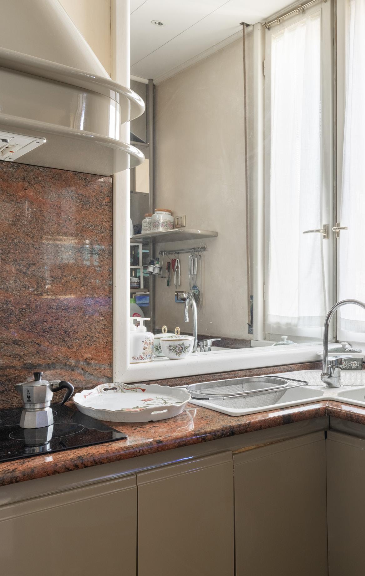La cucina, separata rispetto al living, garantisce praticità e discrezione nei momenti di preparazione. L’impostazione razionale facilita l’uso quotidiano e mantiene ordine visivo, in coerenza con lo stile dell’appartamento.