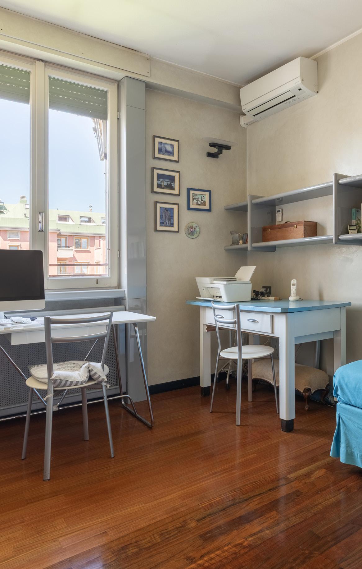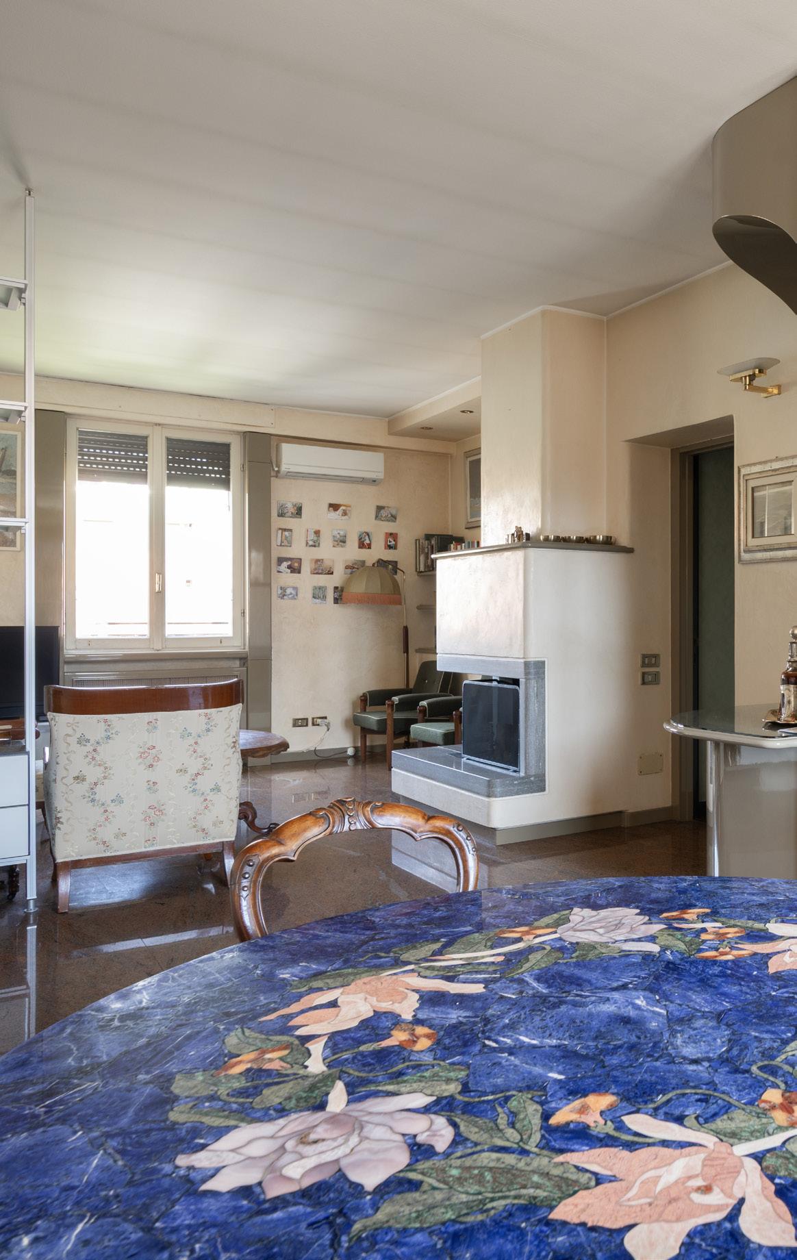 Il salone doppio, luminoso e ben proporzionato, è il fulcro dell’appartamento: uno spazio conviviale che accoglie senza formalità e dialoga con il resto della casa. Le ampie finestre aprono scorci iconici sul centro storico, restituendo profondità e carattere all’ambiente.