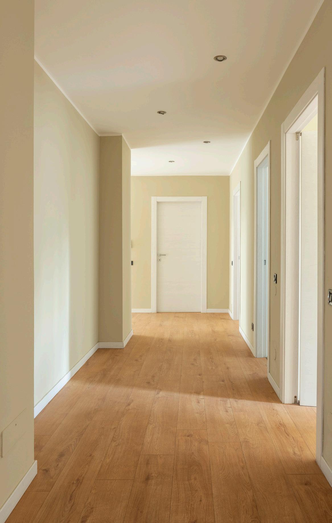Il corridoio, elegante e funzionale, collega gli spazi abitativi. I balconi offrono una vista iconica su San Siro, rendendo gli ambienti di casa luminosi e invitanti.