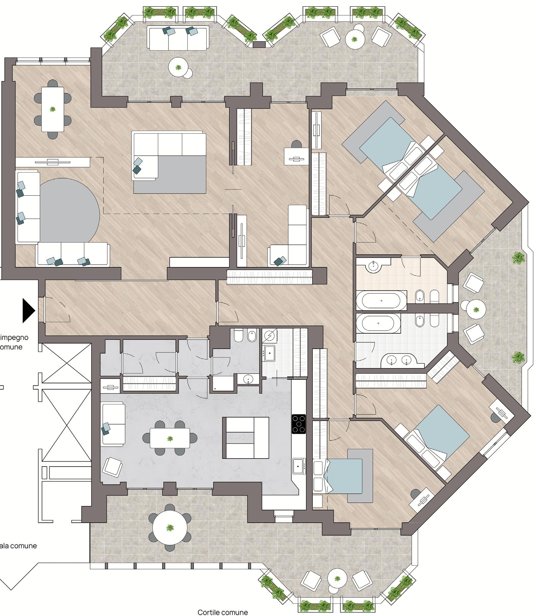L’ingresso, accogliente e curato nei dettagli, dà il benvenuto agli ospiti in un’atmosfera di raffinata eleganza, anticipando l’esperienza straordinaria che li attende all’interno di questa dimora di prestigio.. Il salone triplo e la sala da pranzo di questo appartamento sono la quintessenza del comfort e dello stile. I grandi terrazzi che si affacciano sul giardino condominiale donano una sensazione di pace e serenità, creando l’ambiente perfetto per ritrovarsi e rilassarsi dopo una giornata nella frenesia cittadina.