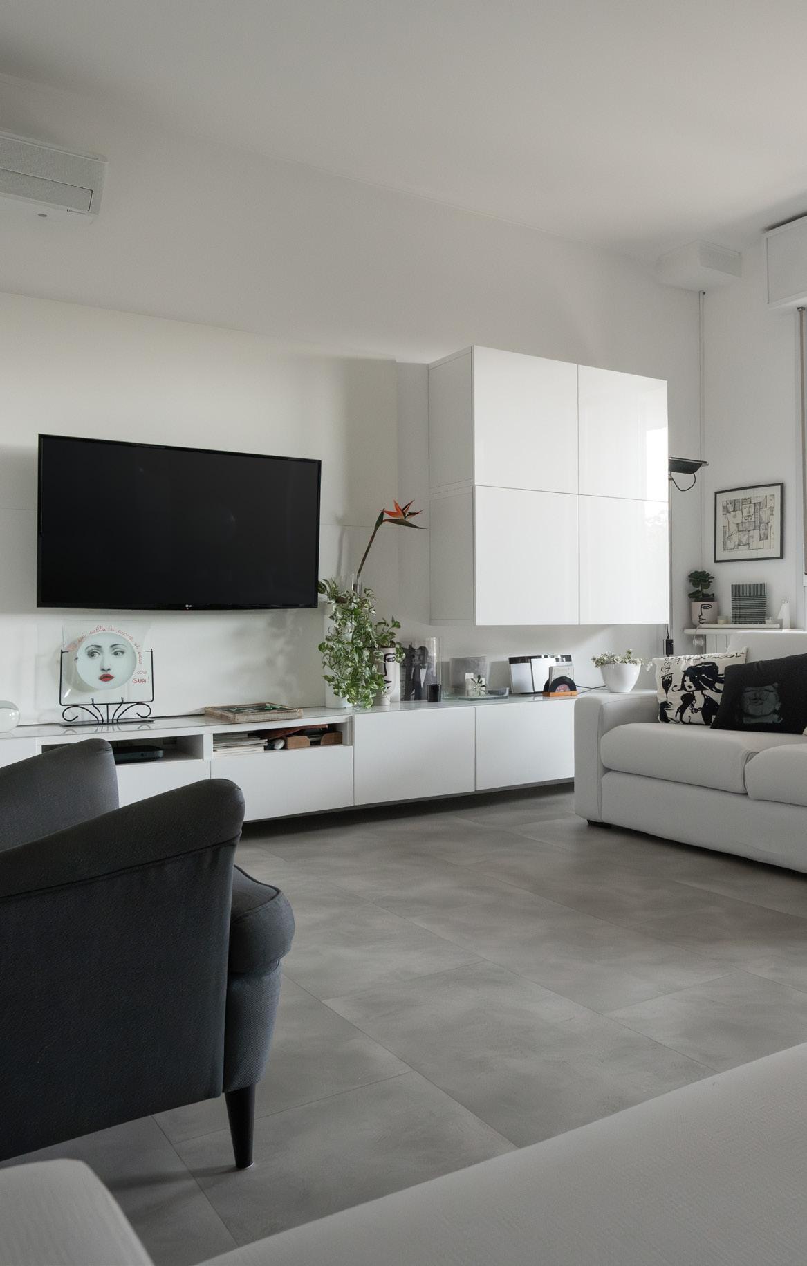 LIVING parete attrezzata con mobili sospesi bianchi e piani d’appoggio continui