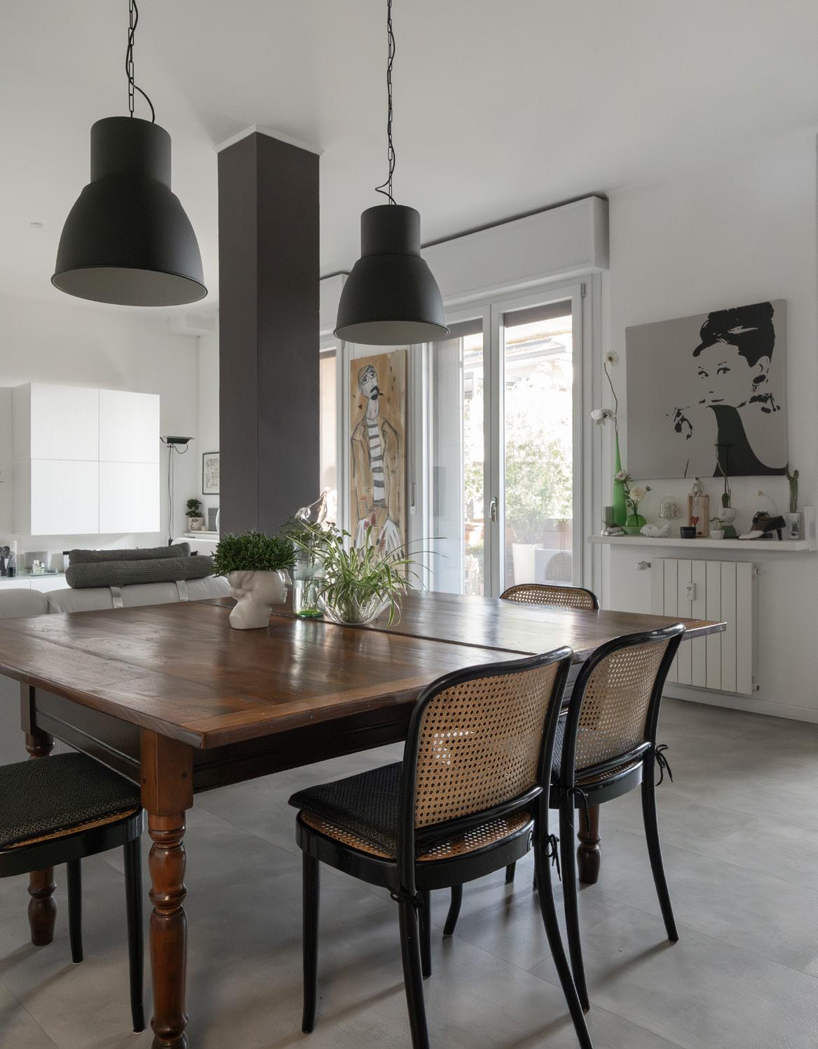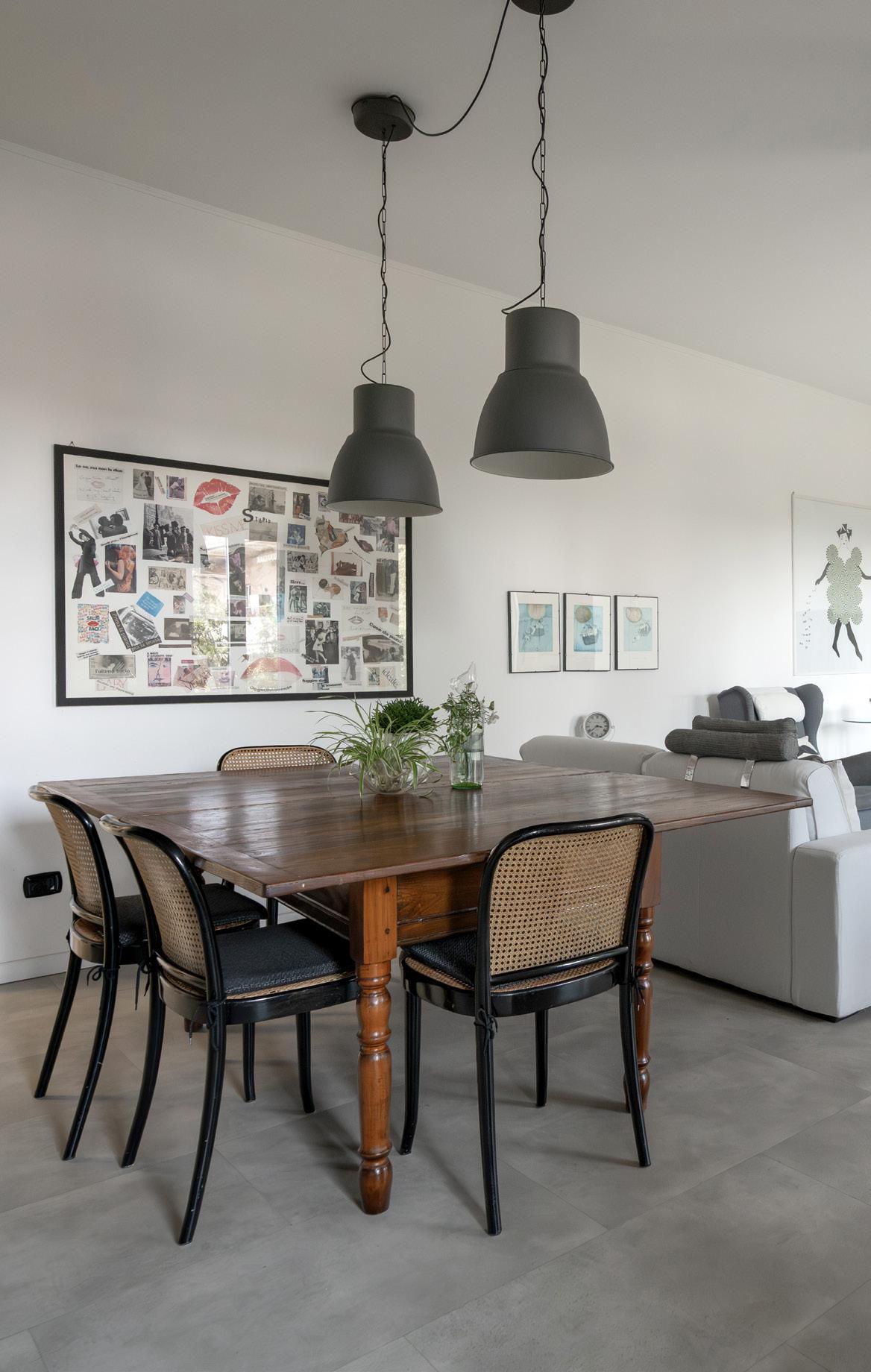 zona dining integrata nel living con tavolo in legno massello e sedute vintage