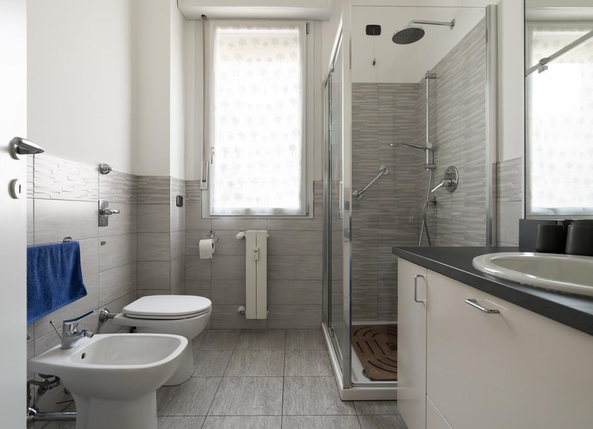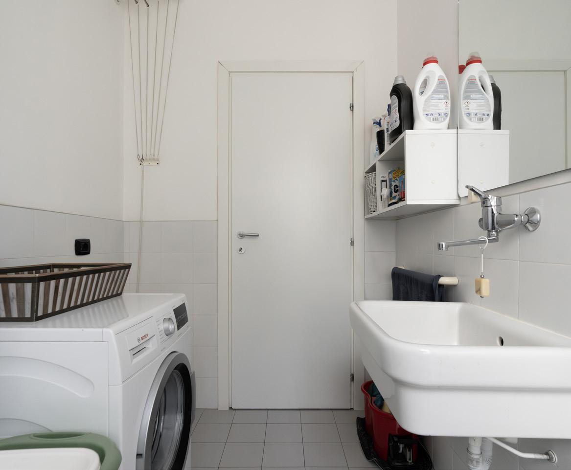 Tre ambienti di servizio: due bagni completi con doccia e un locale lavanderia dedicato. Rivestimenti chiari, piani lavabo funzionali e finestre che garantiscono aria e luce.