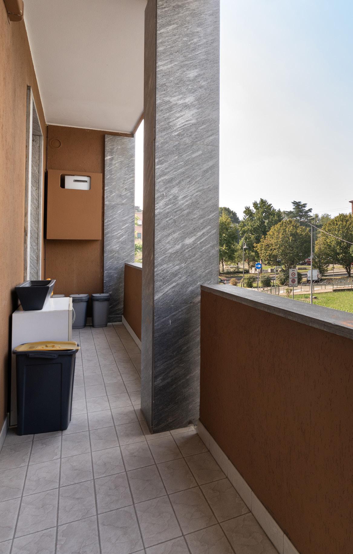 Il balcone si affaccia sul verde del residence, ampliando la percezione degli spazi interni. La pavimentazione neutra e la ringhiera schermata garantiscono privacy e continuità estetica. Un’estensione naturale della cucina e della zona notte per brevi pause e aria nuova.
