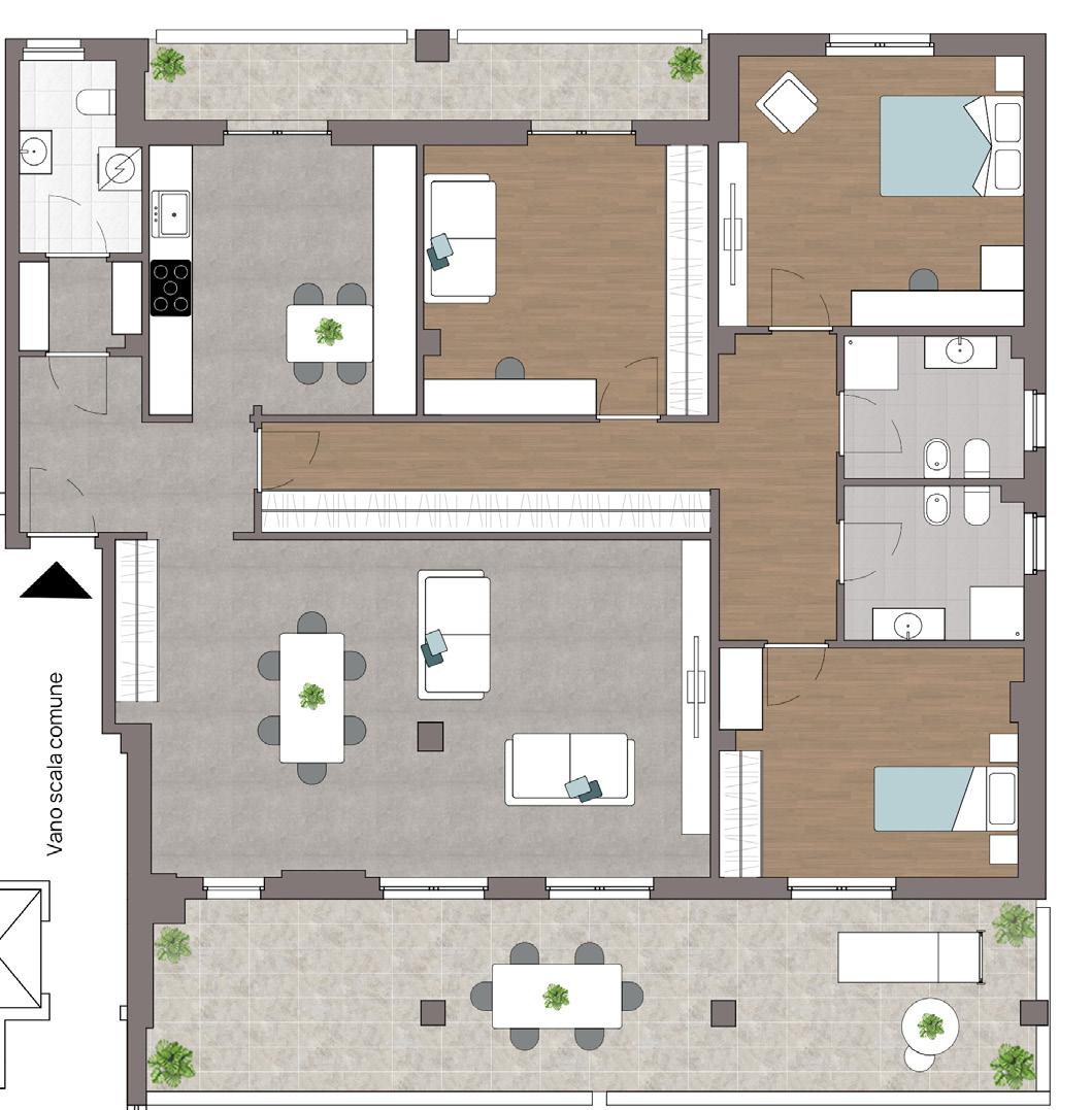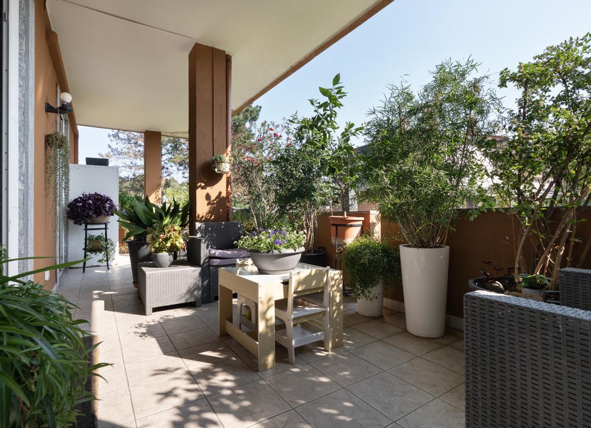 Profondo e ben protetto, il terrazzo diventa una vera stanza all’aperto: un’estensione naturale del living, con passaggi comodi dalla cucina. Le quinte verdi garantiscono privacy e respiro, lasciando entrare luce senza rinunciare alla riservatezza. Arredabile con tavolo e sedute, è lo spazio ideale per pranzi, letture e conversazioni.
