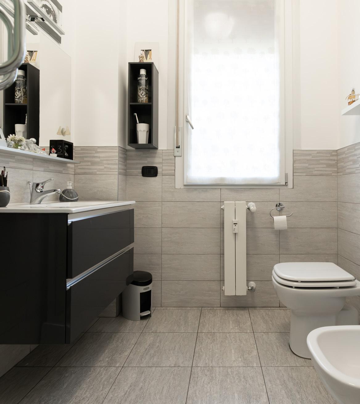 bagno principale con rivestimenti in gres chiaro e finestra su corte interna