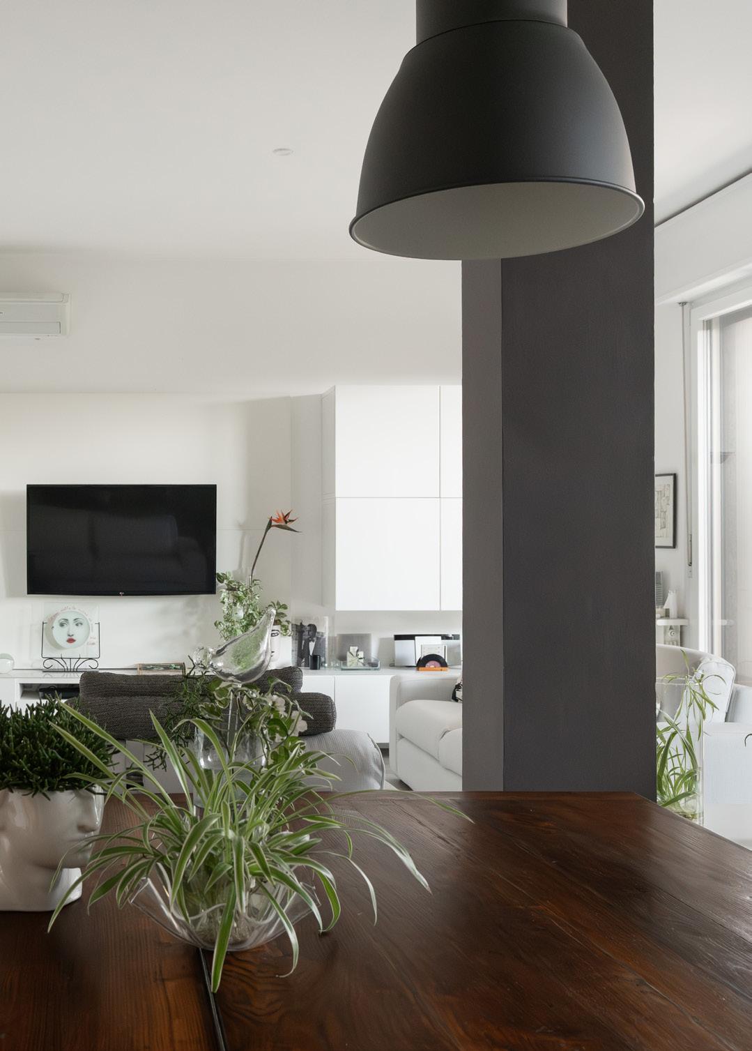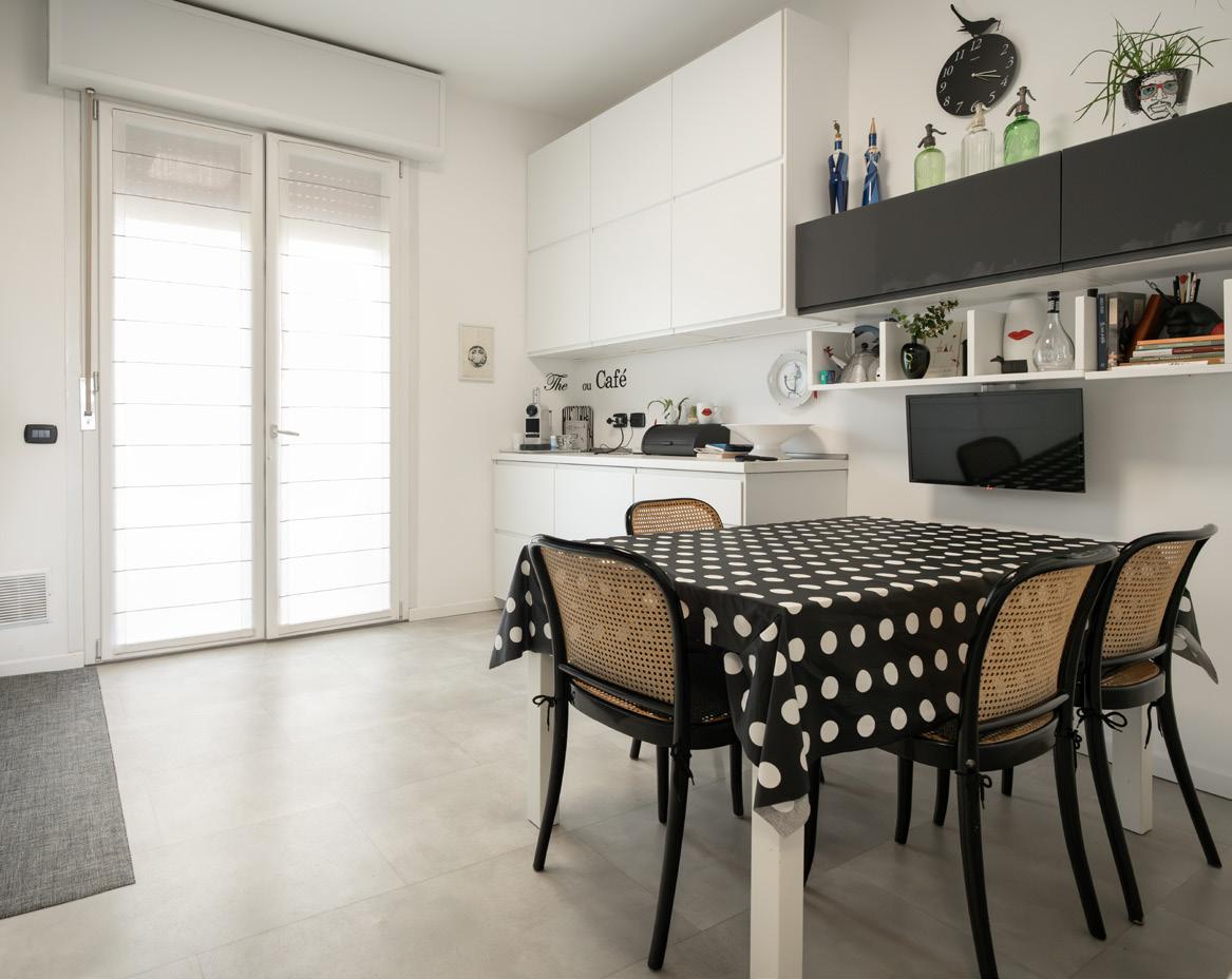 La zona pranzo dialoga in continuità con l’area relax, favorendo convivialità e ordine visivo. Dal living si accede direttamente al terrazzo, ideale per chi desidera fluidità tra interno ed esterno.