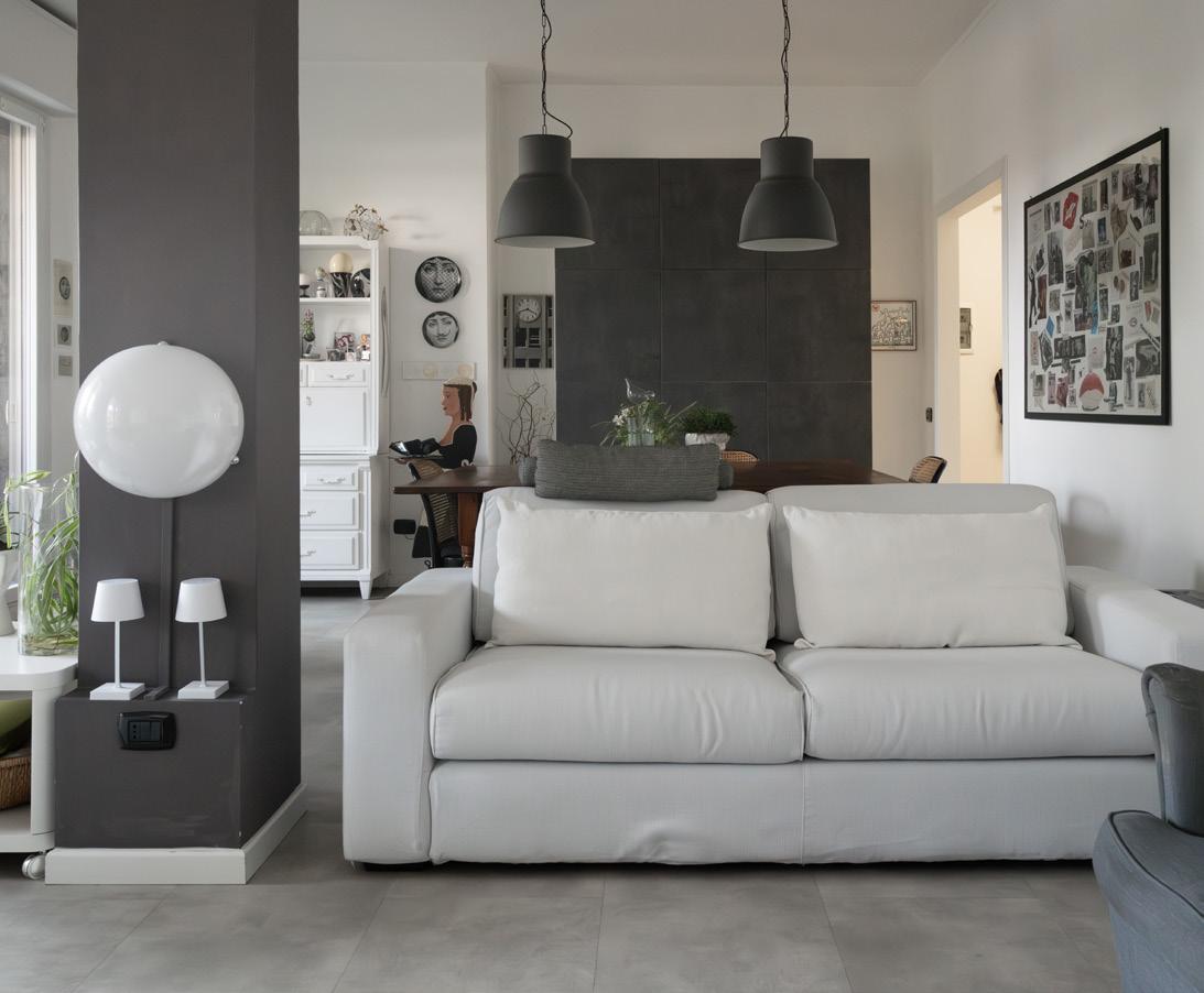 il soggiorno si apre verso l’esterno con ampie vetrate che portano luce tutto il giorno. Le superfici chiare e l’arredo misurato disegnano un ambiente equilibrato e facile da vivere.