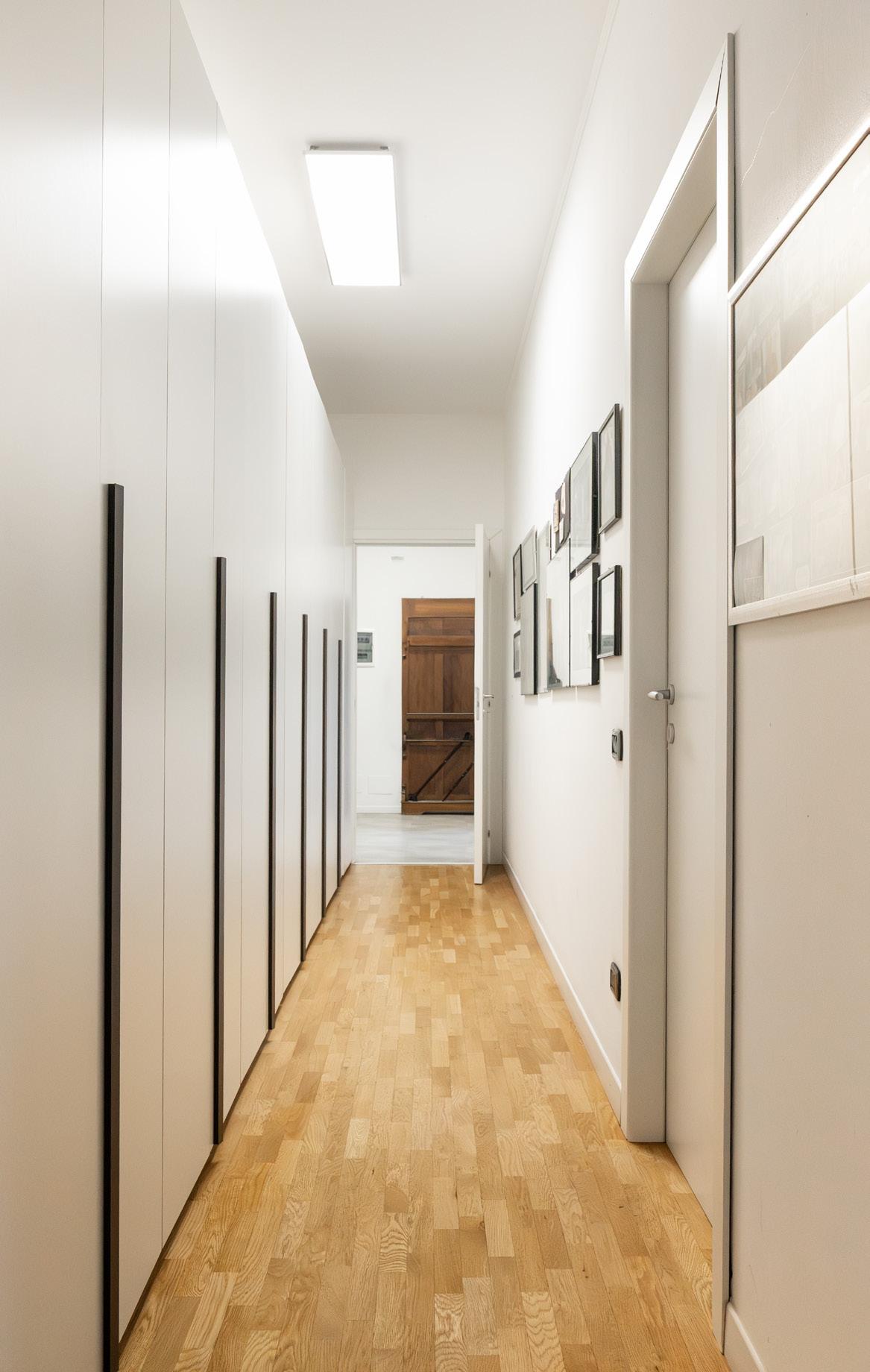 I percorsi interni collegano con continuità i diversi ambienti della casa, favorendo passaggi fluidi tra le funzioni. Soluzioni contenitive integrate mantengono ordine e coerenza senza interrompere la percezione degli spazi.