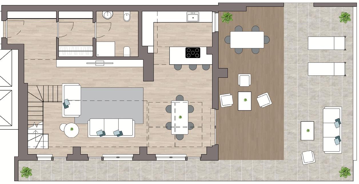 Il soggiorno triplo di questo attico si distingue per la sua generosa metratura e la luminosità che lo caratterizza, grazie alle ampie finestre che si affacciano su due lati dell’abitazione. Questo spazio versatile offre molteplici possibilità di arredamento e organizzazione, consentendo di creare diverse zone funzionali come area relax, zona pranzo e spazio per intrattenere gli ospiti. La disposizione aperta e ariosa lo rende il centro nevralgico dell’abitazione, ideale per vivere e condividere momenti speciali in un ambiente accogliente ed esclusivo.