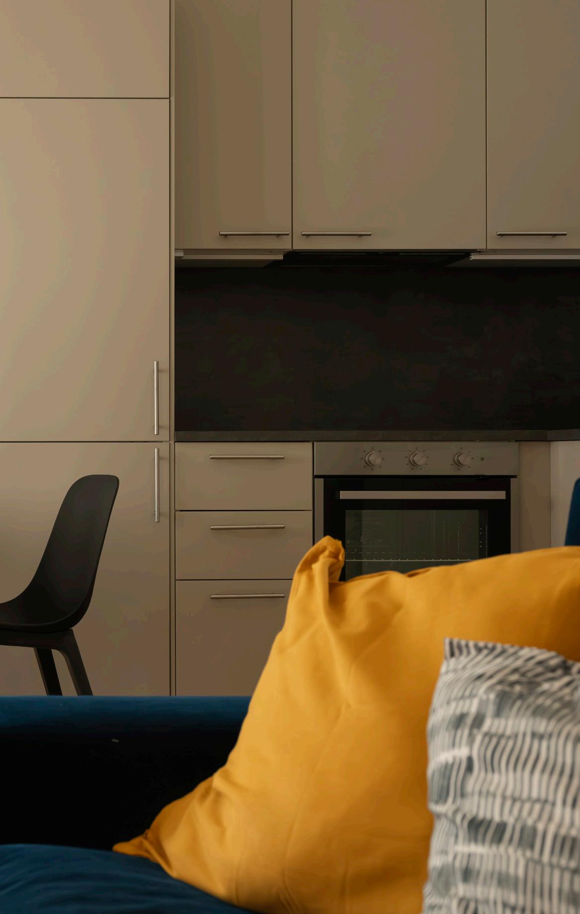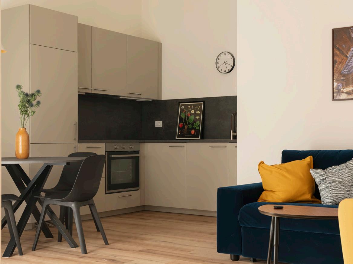 La cucina a vista si integra con misura e discrezione nella zona giorno, regalando una continuità visiva pulita e moderna. Pensata per chi ama cucinare anche durante un soggiorno temporaneo, è dotata di tutti gli elementi essenziali. Superfici compatte ma ben organizzate, linee essenziali e una posizione strategica rispetto al balcone: uno spazio funzionale che non rinuncia all’eleganza.