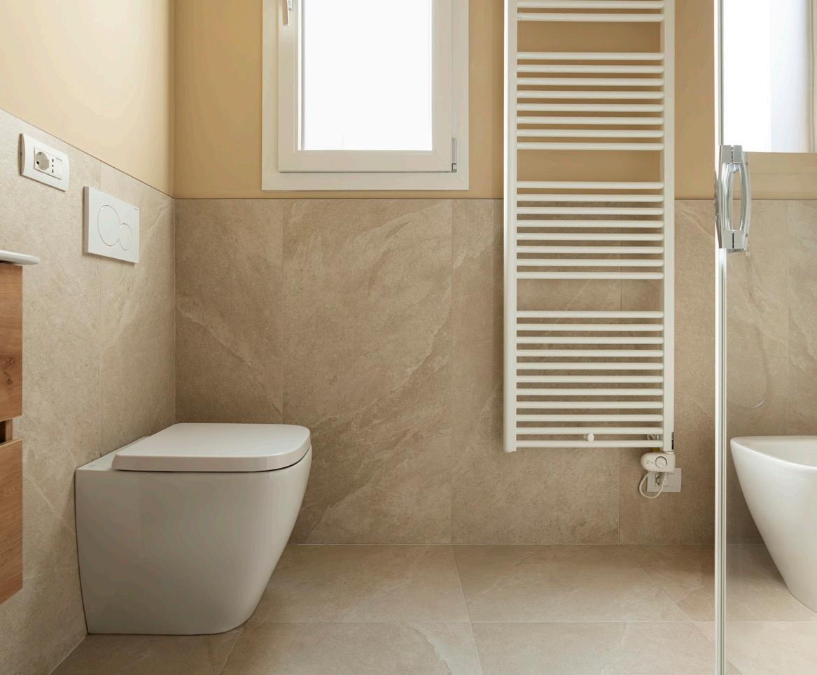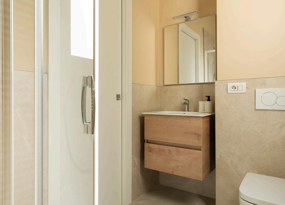 Il bagno è moderno, razionale e ben accessoriato. Le finiture contemporanee e le tonalità neutre creano un ambiente ordinato e piacevole, dove ogni dettaglio è pensato per la praticità d’uso.