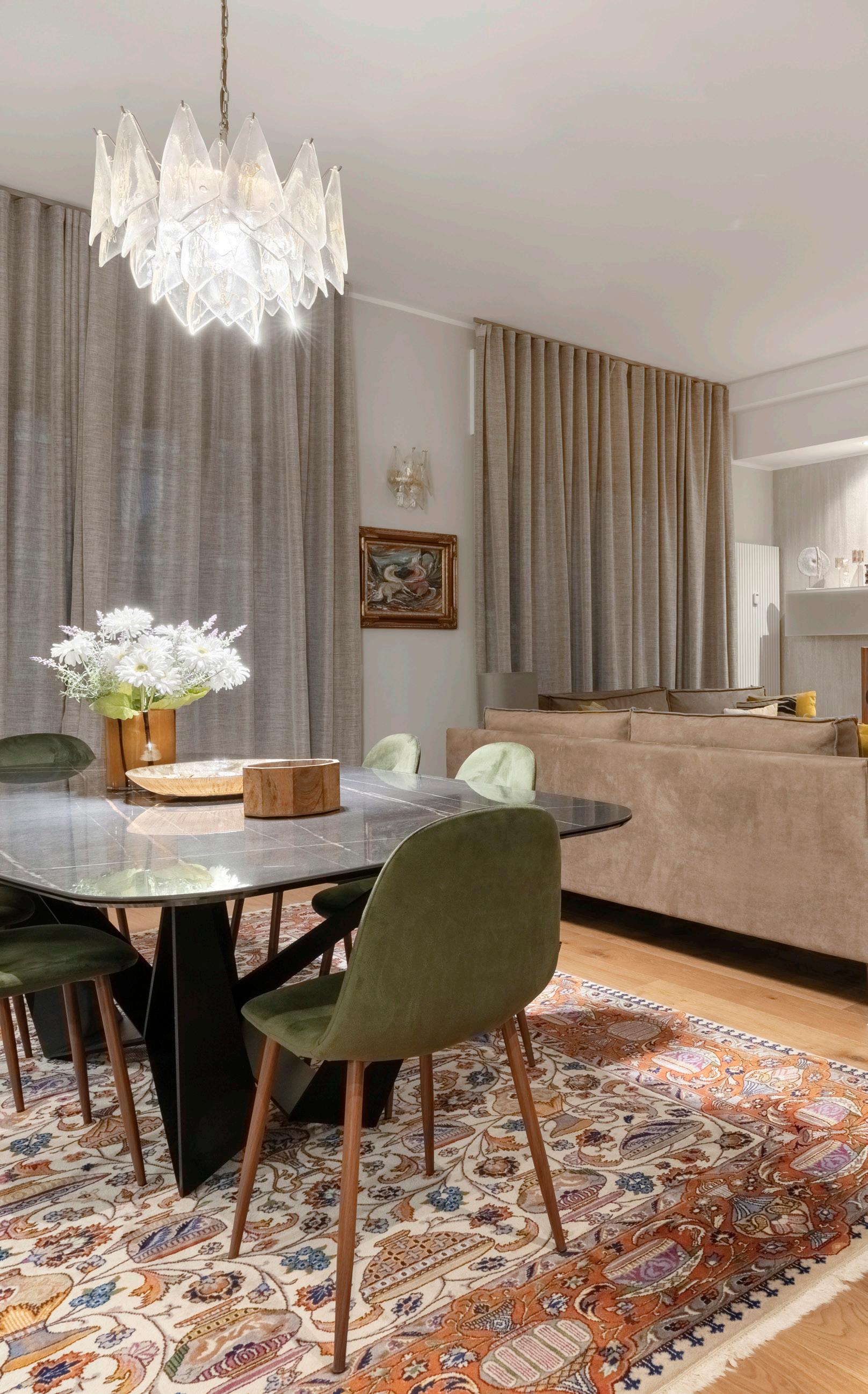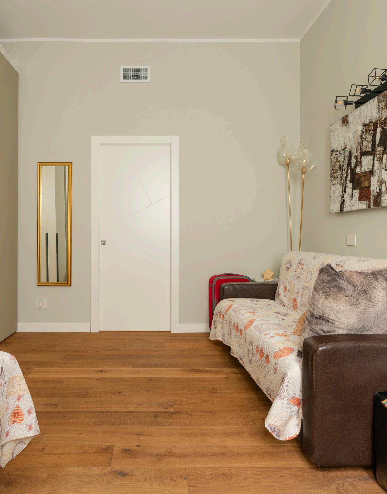 Appena varcata la soglia l’accoglienza è di classe. L’ingresso è curato nei minimi dettagli, con armadi su misura che si fondono perfettamente con l’architettura moderna dell’appartamento. Da qui, si apre il luminoso salone di rappresentanza, un ampio spazio progettato per accogliere con stile. Due grandi finestre inondano la stanza di luce naturale, mentre l’arredamento curato e la disposizione impeccabile degli spazi invitano a vivere momenti di relax o a ricevere ospiti in un ambiente prestigioso.