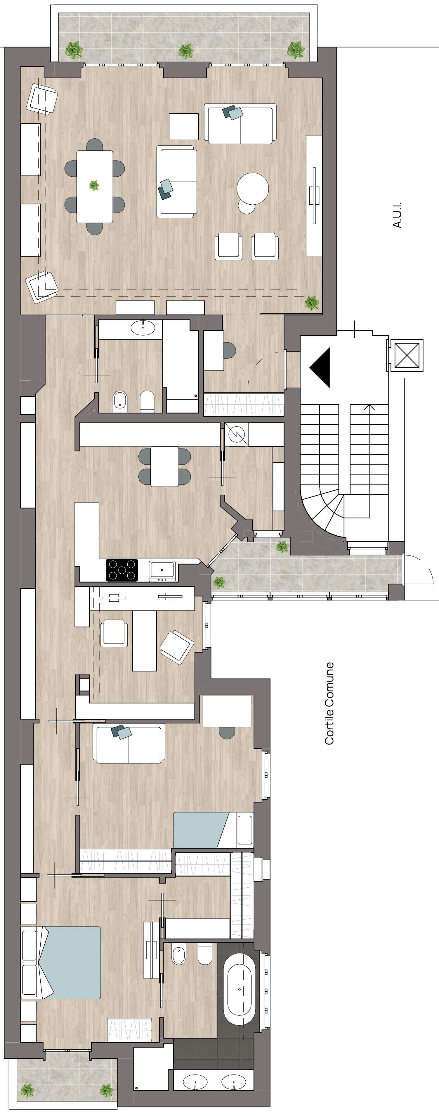 Ogni bagno dell’appartamento è una piccola oasi di lusso. Le finiture in gres di qualità si uniscono a dettagli moderni per offrire un’esperienza di benessere quotidiano. La scelta dei materiali, così come la disposizione degli spazi, è pensata per coniugare estetica e funzionalità, offrendo a te ed i tuoi ospiti un comfort di altissimo livello.