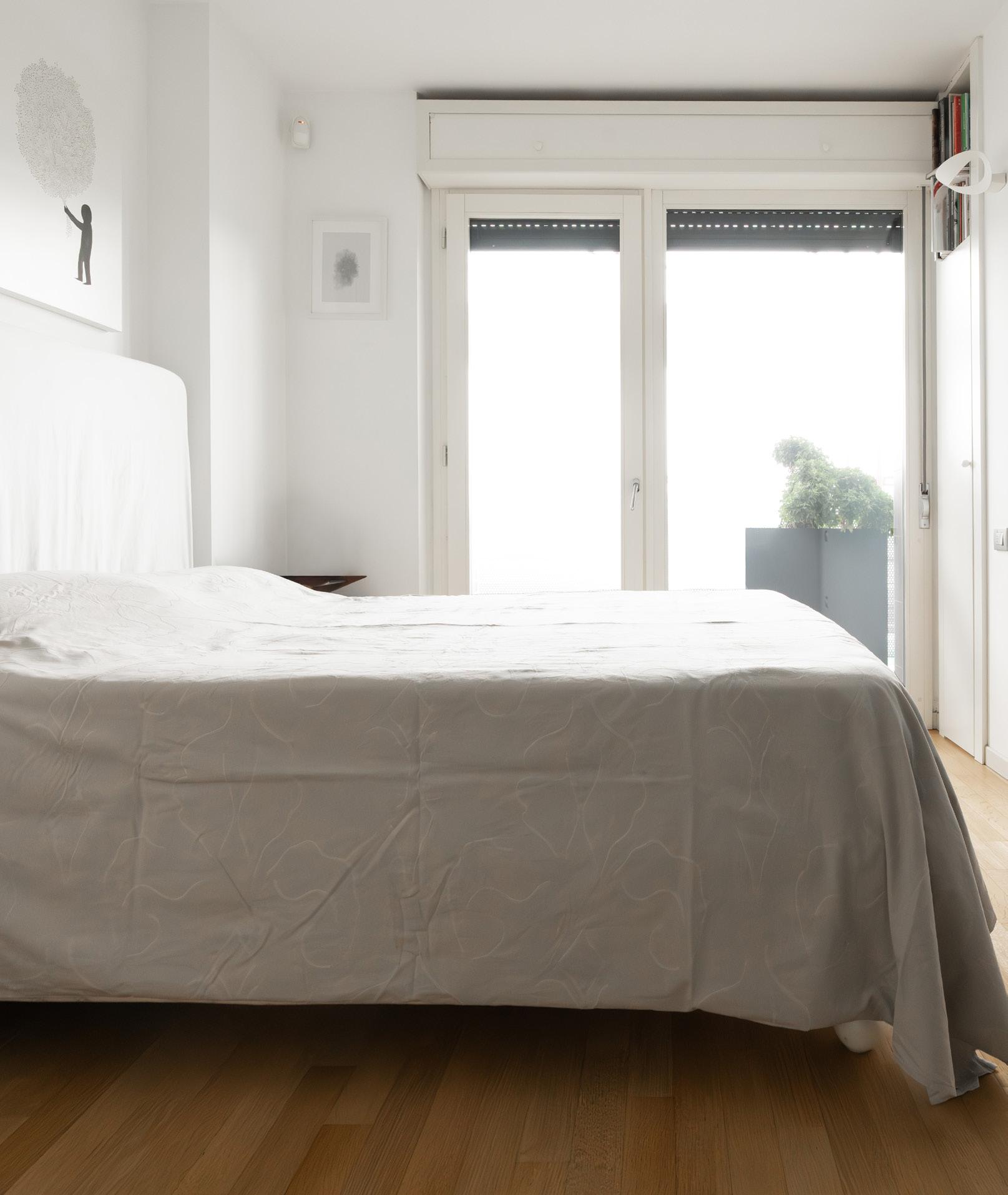 Le camere, poste al piano superiore, si distinguono per quiete e luminosità . La camera principale, ampia e regolare, si affaccia su un balcone riservato; la seconda stanza, più raccolta, è perfetta come studio o ambiente per ospiti. I toni chiari e i materiali caldi creano un’atmosfera rilassata, mentre l’illuminazione naturale esalta le proporzioni. Spazi pensati per offrire benessere e privacy, senza rinunciare al gusto contemporaneo.