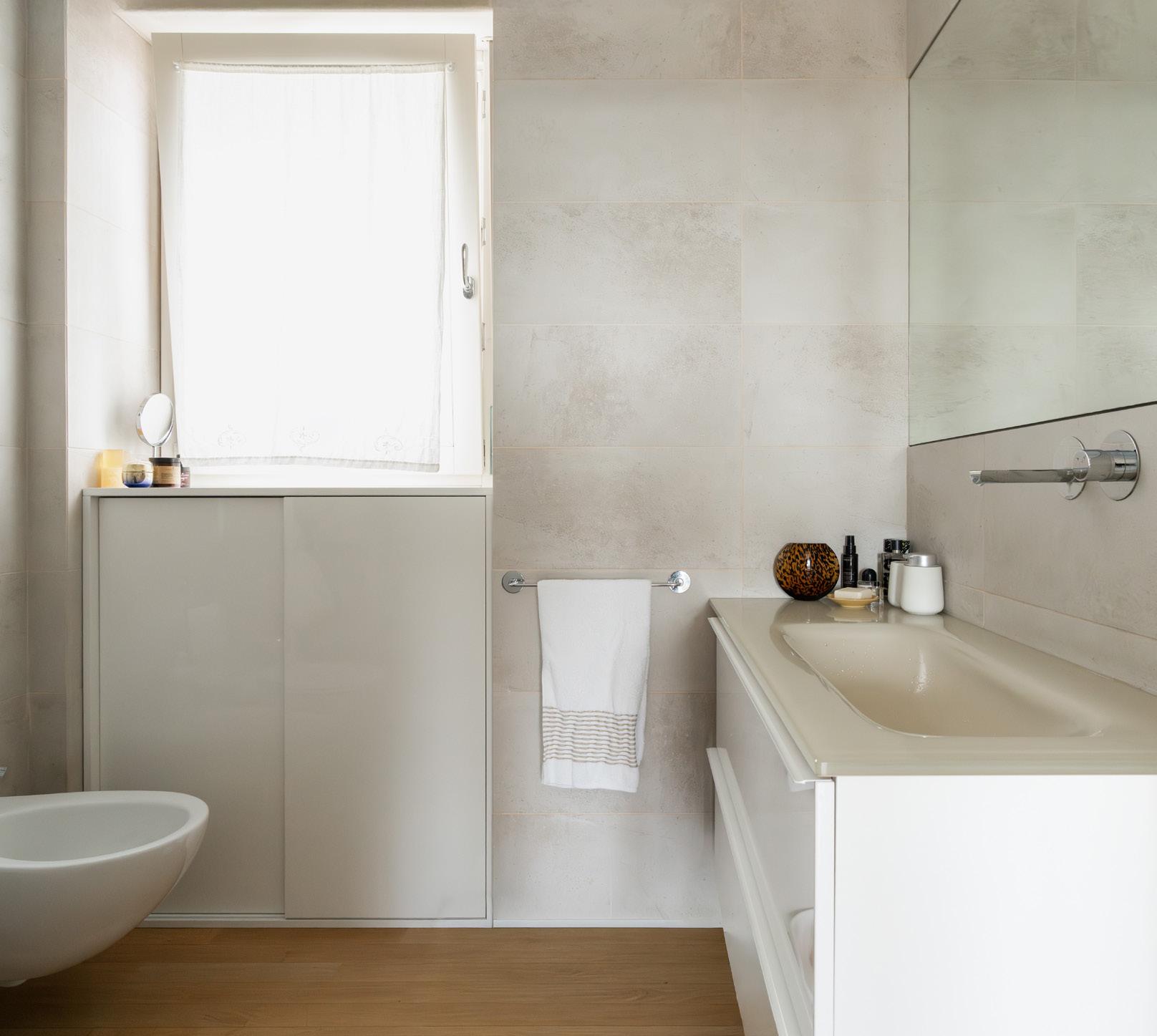 I bagni sono rivestiti in gres chiaro e arredati con mobili su misura dalle linee essenziali. L’organizzazione razionale degli spazi, la presenza di doccia a filo pavimento e l’illuminazione diffusa definiscono ambienti funzionali e accoglienti. Ogni elemento, dai rubinetti ai dettagli in metallo satinato, è scelto per restituire ordine, pulizia visiva e qualità quotidiana.