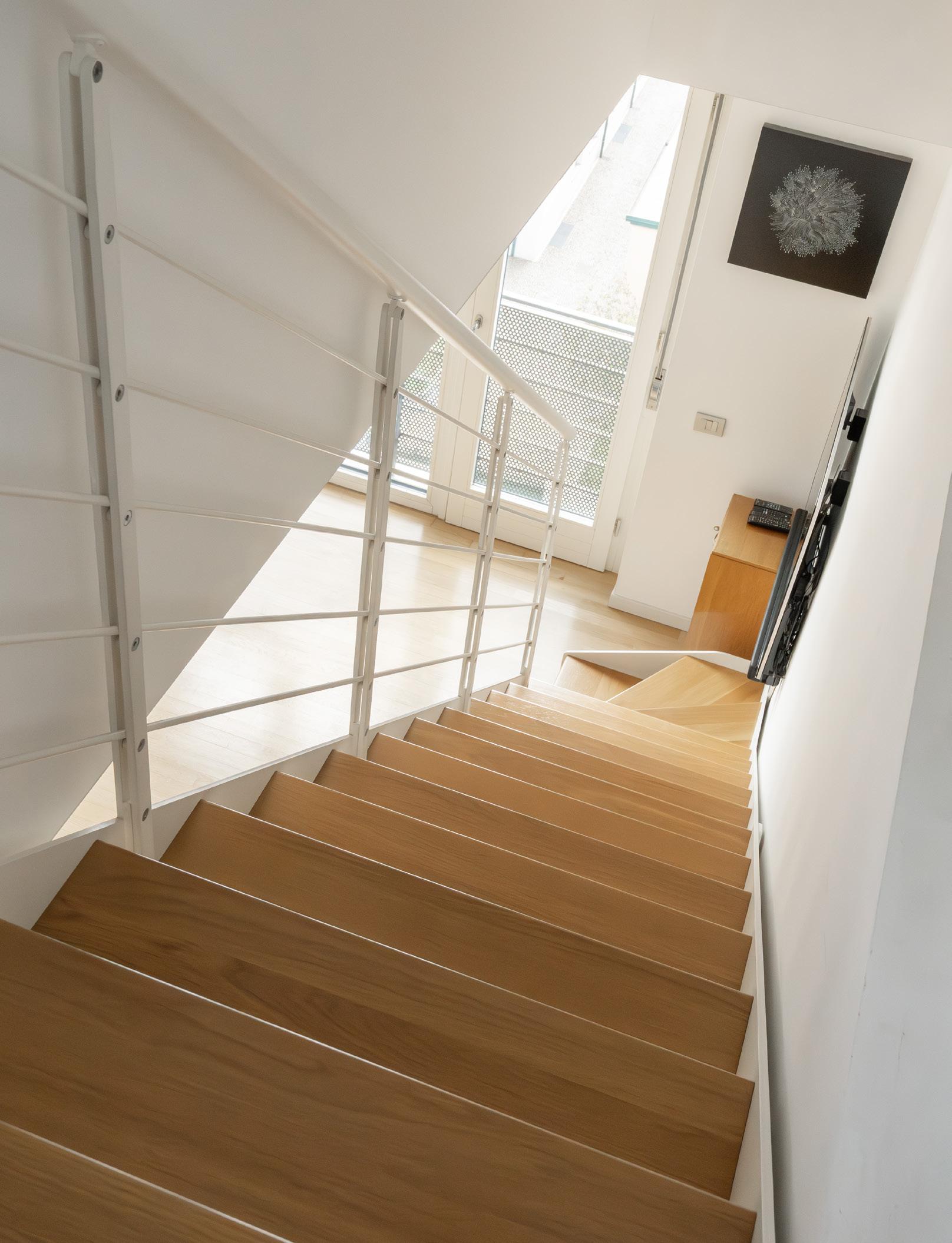 La scala interna in metallo e legno lega con eleganza i due livelli dell’abitazione. Leggera, essenziale, diventa parte integrante dell’arredo, dialogando con la luminosità dell’ambiente. Il disimpegno superiore introduce gli spazi privati con ordine e coerenza, regalando la sensazione di una casa ben progettata, dove estetica e funzionalità convivono in equilibrio.