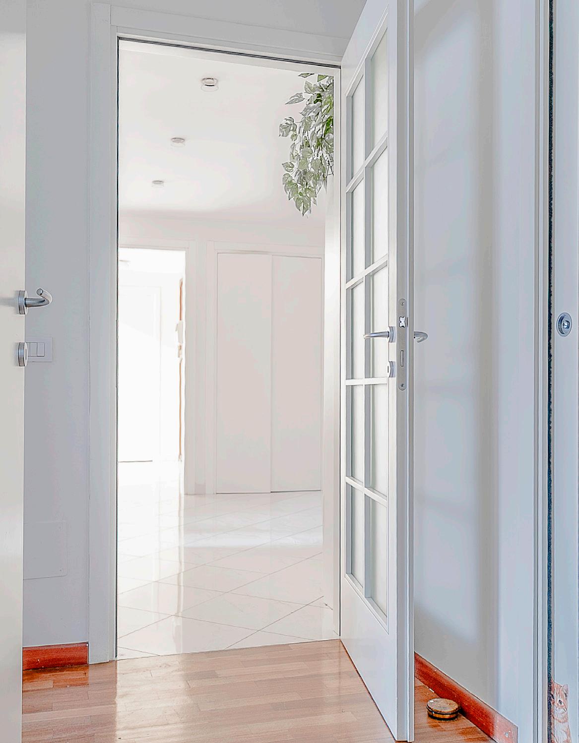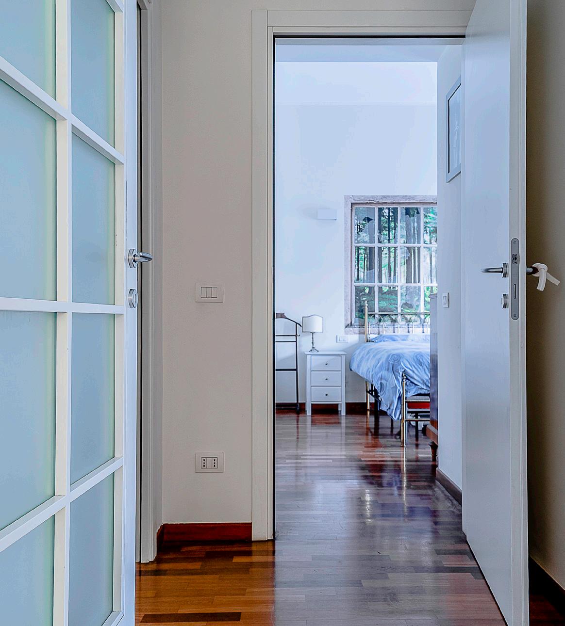 Il corridoio distribuisce gli ambienti con ordine, mantenendo coerenza tra luce, materiali e proporzioni.