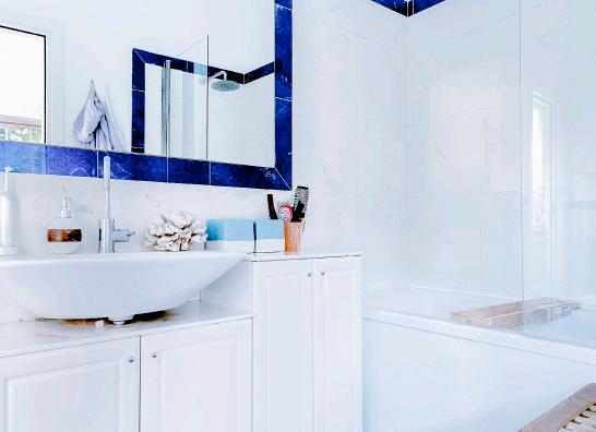 ceramiche neutre e fascia blu decorativa caratterizzano l’estetica dei locali
