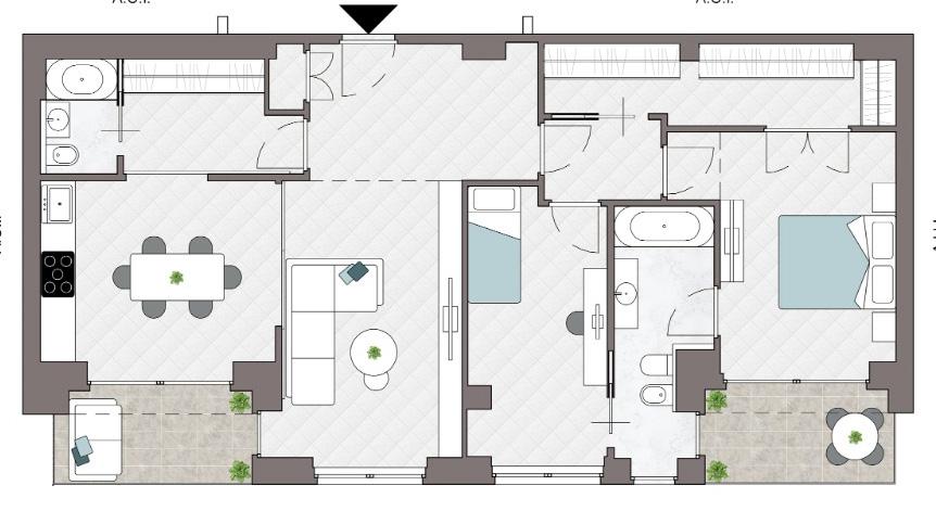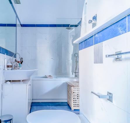 I due bagni, ristrutturati con ceramiche di qualità, presentano soluzioni moderne e finiture armoniose. Ogni ambiente è progettato per massimizzare comfort e praticità. Un linguaggio pulito che valorizza l’intero appartamento.
