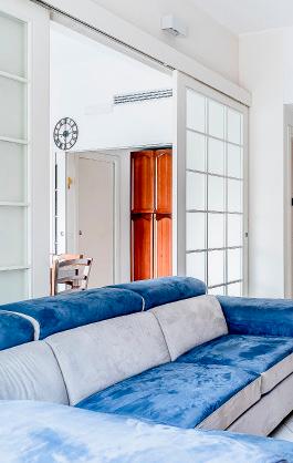 Le finiture chiare amplificano l’ariosità dell’ambiente, mantenendo un tono elegante e misurato. Un ambiente pensato per accogliere, rilassarsi e godere della vista urbana.
