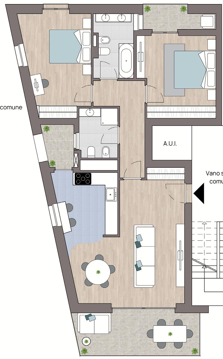 I due balconi e il terrazzo al piano offrono spazi all’aperto ideali per godersi momenti di relax o per cene all’aperto. L’affaccio sul cortile interno garantisce tranquillità, creando un’oasi di pace nel cuore della città.