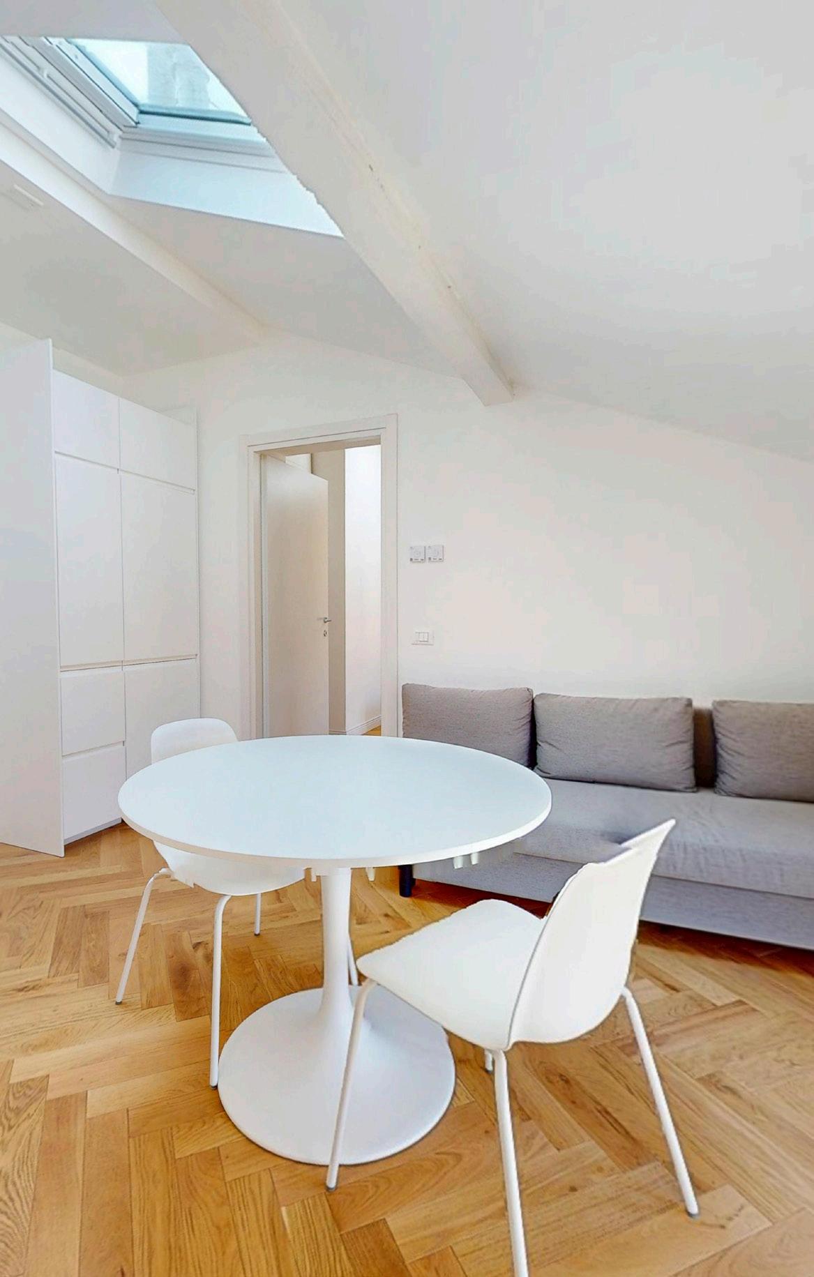 Il soggiorno si apre come un salotto aereo: soffitti alti con travi a vista, luce che filtra dai velux automatizzati, tonalità calde del parquet a spina italiana. Una zona pensata per rilassarsi, leggere, intrattenere o semplicemente osservare il cielo. L’arredo integrato valorizza gli spazi e amplifica il senso di armonia.