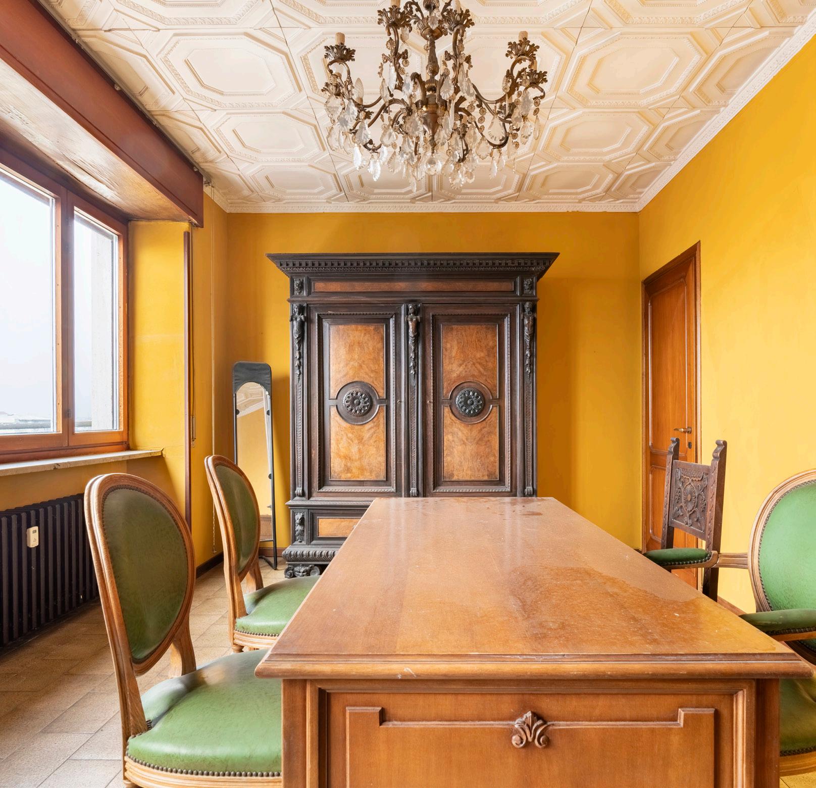 L’ingresso accoglie con uno spazioso salone triplo che si apre su un balcone con vista su Viale Misurata. Grandi finestre inondano l’ambiente di luce naturale, enfatizzando i soffitti alti 3,3 metri e i dettagli decorativi originali, come i gessi che adornano il soffitto. Il salone, con le sue aree dedicate al relax, alla conversazione e alla convivialità, rappresenta il centro versatile dell’appartamento, ideale per momenti di raffinatezza e convivialità.