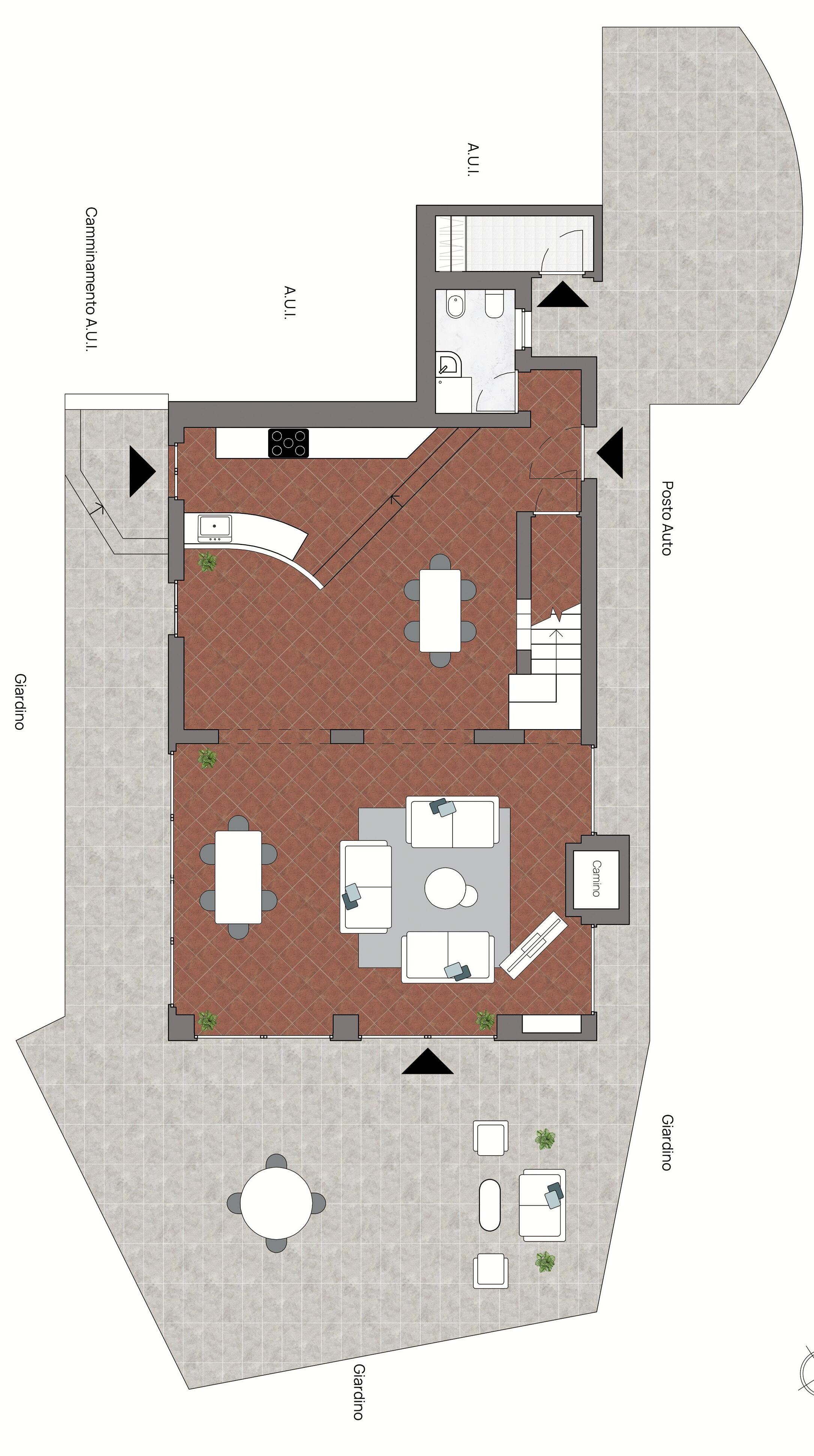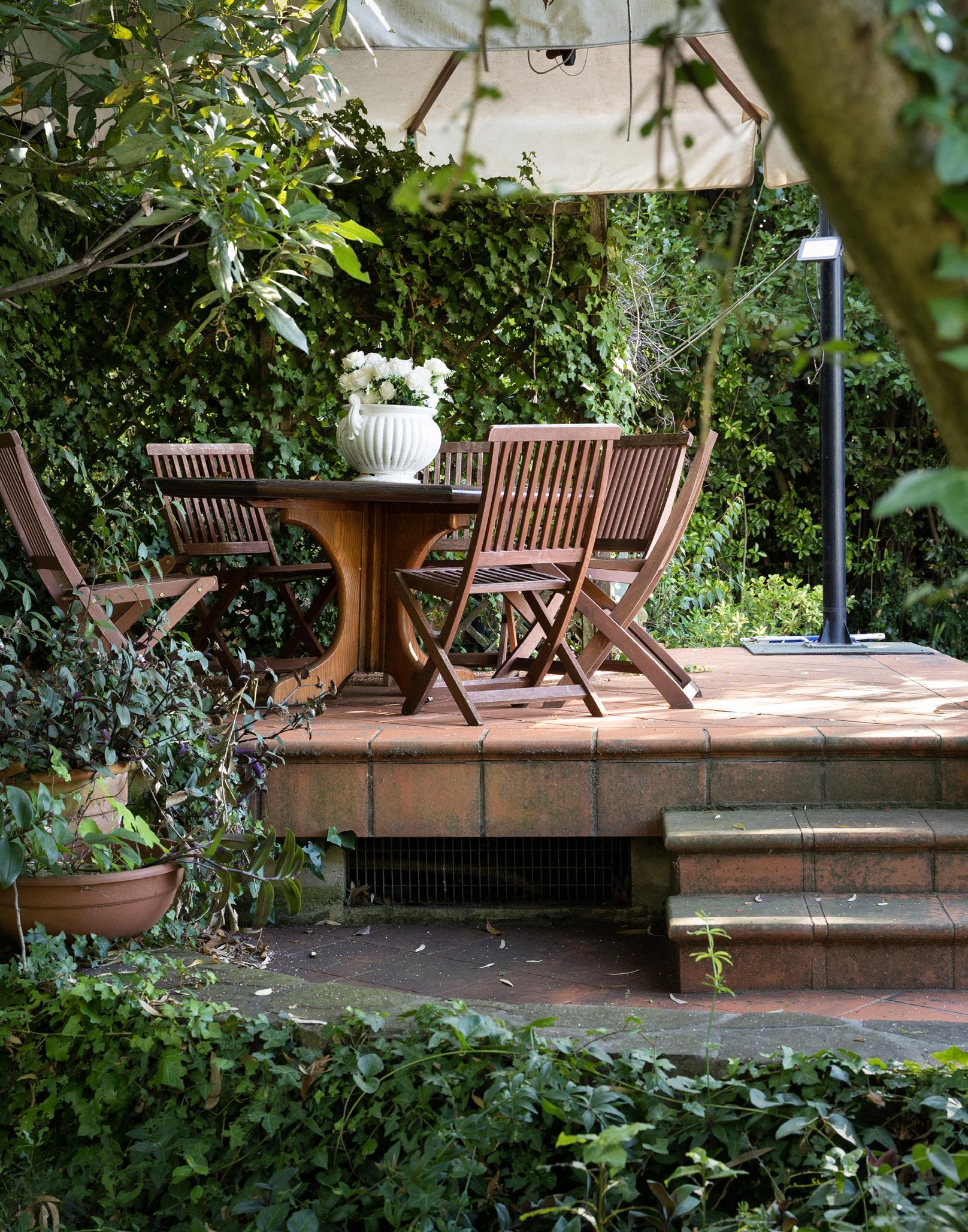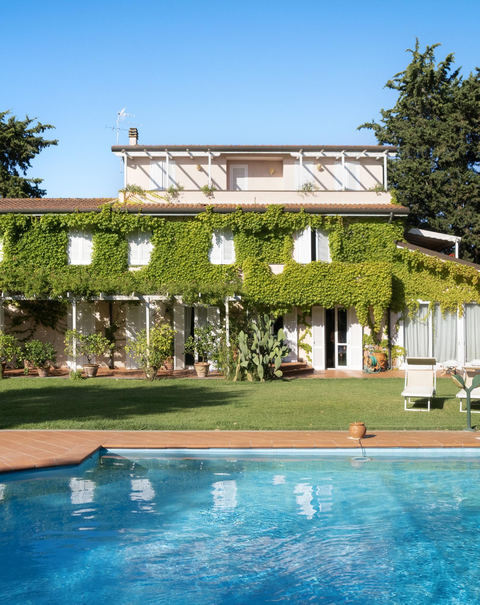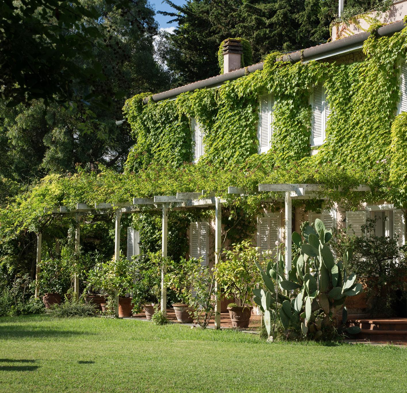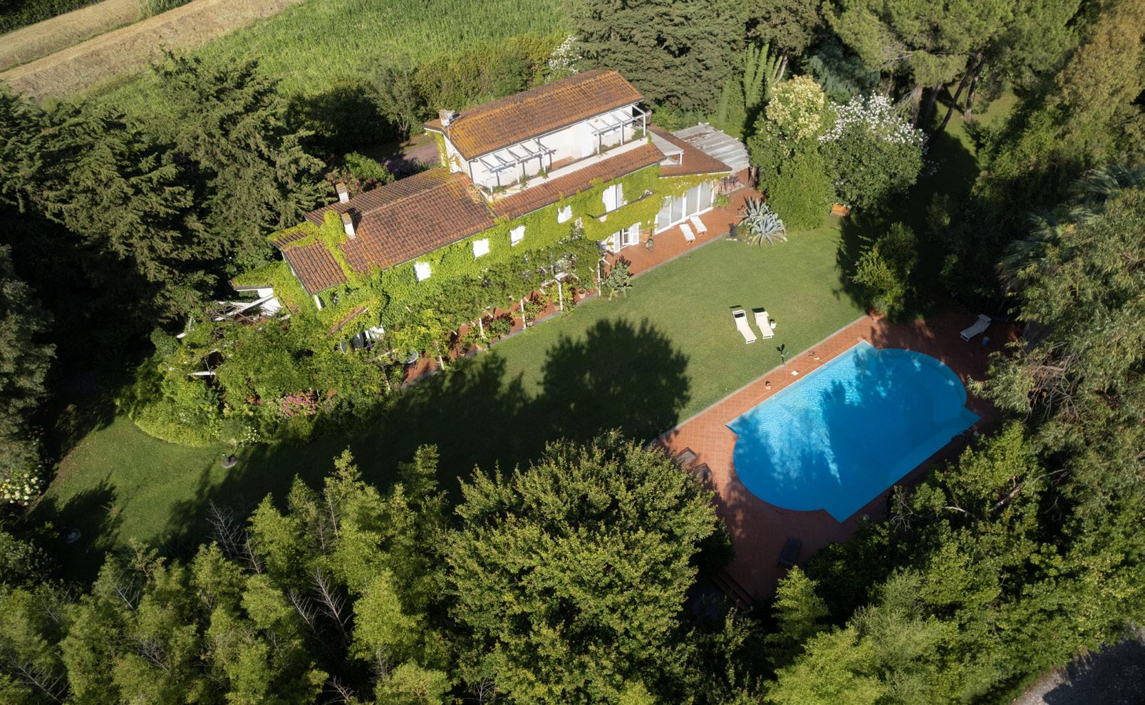 Passato il cancello d’ingresso si percorre un vialetto che svela la villa solo dopo qualche metro. Piante ad alto fusto ed una vegetazione curata decorano il giardino privato di circa 10.000 mq. Una rigogliosa edera ricopre l’intera facciata della villa. La piscina di quasi 17 metri di lunghezza completa lo scenario. Il parcheggio coperto e isolato è nascosto dalla fitta vegetazione.