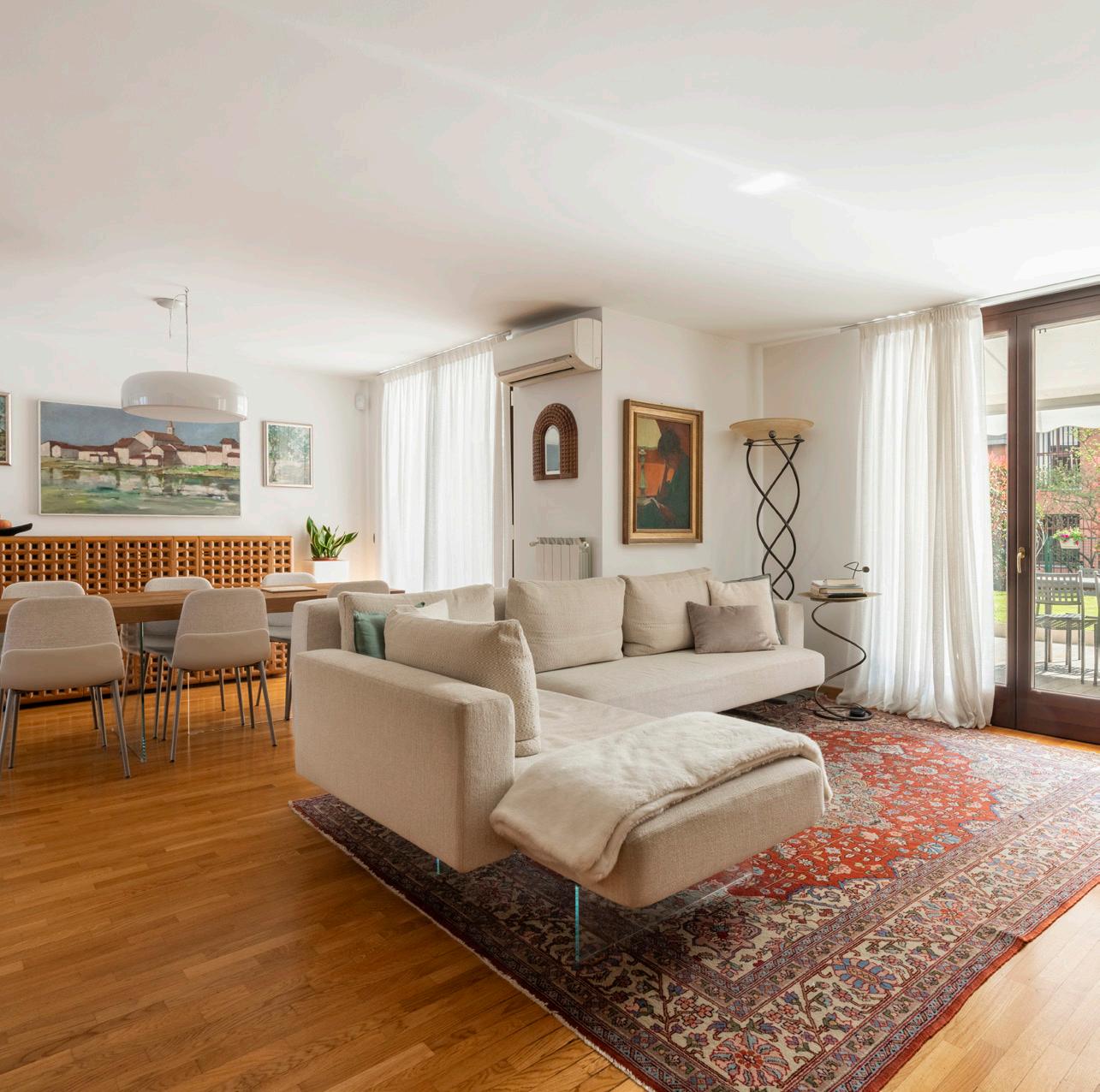 Il cuore accogliente della casa si apre con un ampio salone doppio, perfettamente distribuito tra area relax e zona pranzo. L’atmosfera calda è esaltata dal parquet in rovere, dalle grandi vetrate e dalla continuità con l’esterno. Uno spazio versatile che regala respiro e convivialità, perfetto per la vita quotidiana o per ricevere con eleganza.