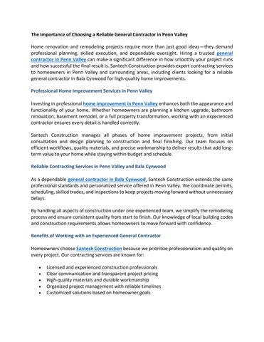 Home renovation and remodeling projects require more than just good ideas they demand professional planning, skilled execution, and dependable oversight. Hiring a trusted general contractor in Penn Valley can make a significant difference in how smoothly your project runs and how successful the final result is. Santech Construction provides expert contracting services to homeowners in Penn Valley and surrounding areas, including clients looking for a reliable general contractor in Bala Cynwood for high-quality home improvements.
