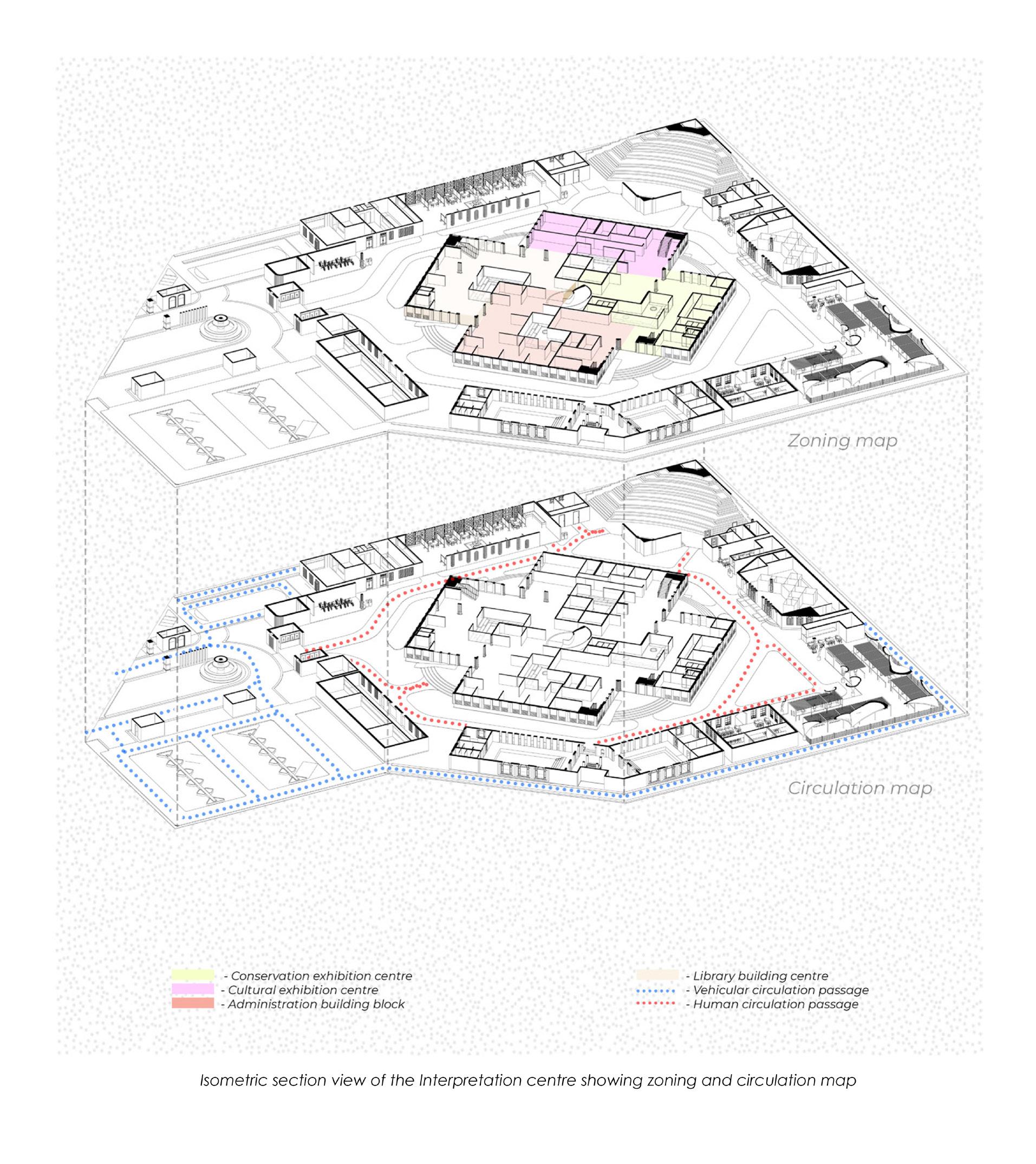 Isometric section view of the Interpretation centre showing zoning and circulation map