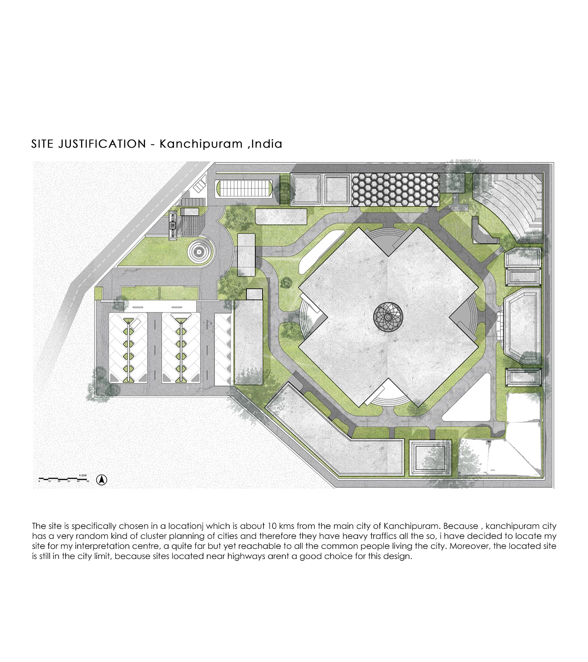 The site is specifically chosen in a locationj which is about 10 kms from the main city of Kanchipuram. Because , kanchipuram city has a very random kind of cluster planning of cities and therefore they have heavy traffics all the so, i have decided to locate my site for my interpretation centre, a quite far but yet reachable to all the common people living the city. Moreover, the located site is still in the city limit, because sites located near highways arent a good choice for this design.