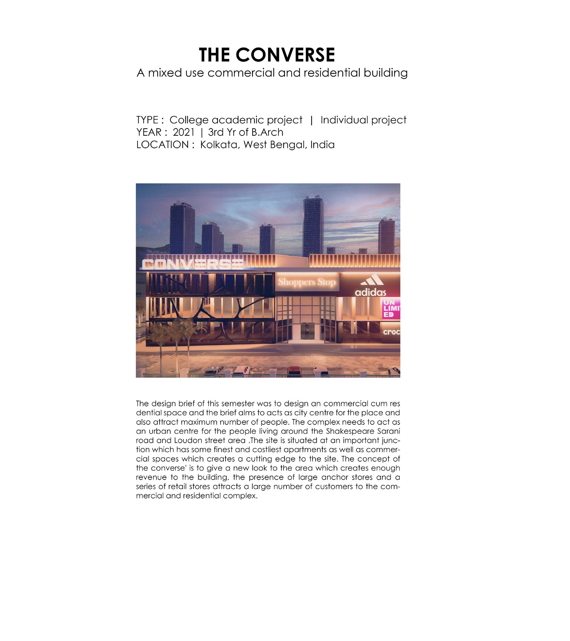 The design brief of this semester was to design an commercial cum residential space and the brief alms to acts as city centre for the place and also attract maximum number of people. The complex needs to act as an urban centre for the people living around the Shakespeare Sarani road and Loudon street area .The site is situated at an important junction which has some finest and costliest apartments as well as commercial spaces which creates a cutting edge to the site. The concept of the converse’ is to give a new look to the area which creates enough revenue to the building. the presence of large anchor stores and a series of retail stores attracts a large number of customers to the commercial and residential complex.