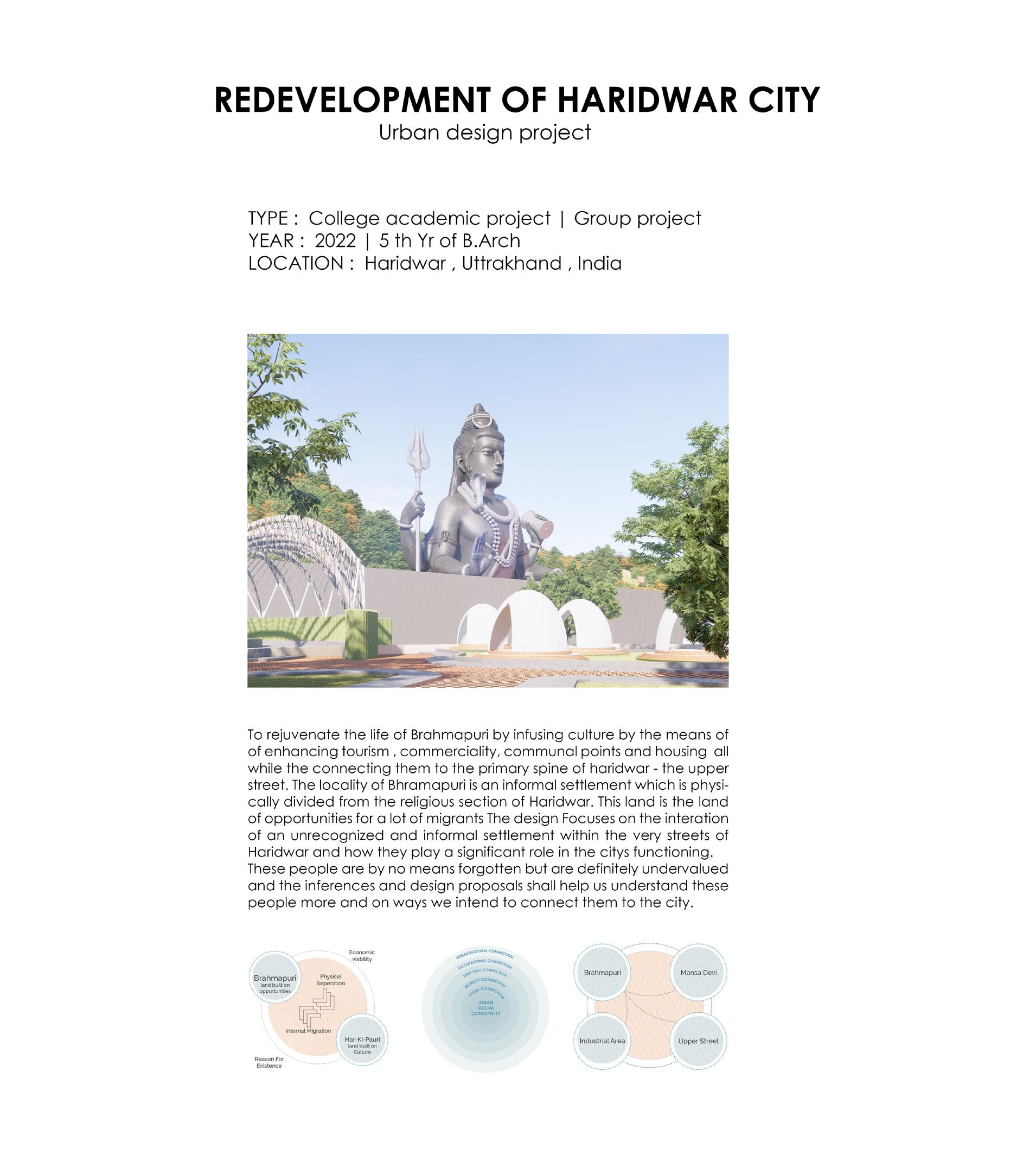To rejuvenate the life of Brahmapuri by infusing culture by the means of of enhancing tourism , commerciality, communal points and housing all while the connecting them to the primary spine of haridwar - the upper street. The locality of Bhramapuri is an informal settlement which is physically divided from the religious section of Haridwar. This land is the land of opportunities for a lot of migrants The design Focuses on the interation of an unrecognized and informal settlement within the very streets of Haridwar and how they play a significant role in the citys functioning. These people are by no means forgotten but are definitely undervalued and the inferences and design proposals shall help us understand these people more and on ways we intend to connect them to the city.