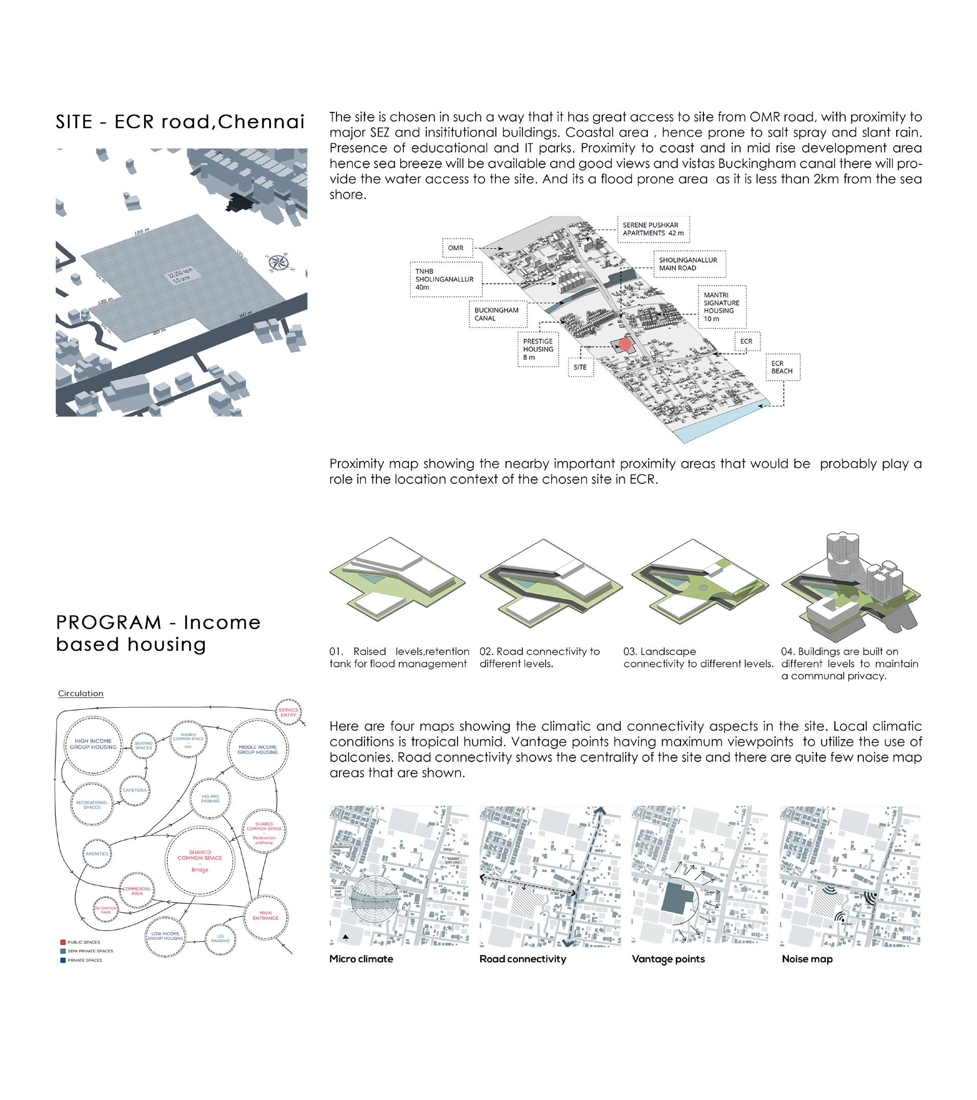The site is chosen in such a way that it has great access to site from OMR road, with proximity to major SEZ and insititutional buildings. Coastal area , hence prone to salt spray and slant rain. Presence of educational and IT parks. Proximity to coast and in mid rise development area hence sea breeze will be available and good views and vistas Buckingham canal there will provide the water access to the site. And its a flood prone area as it is less than 2km from the sea shore.