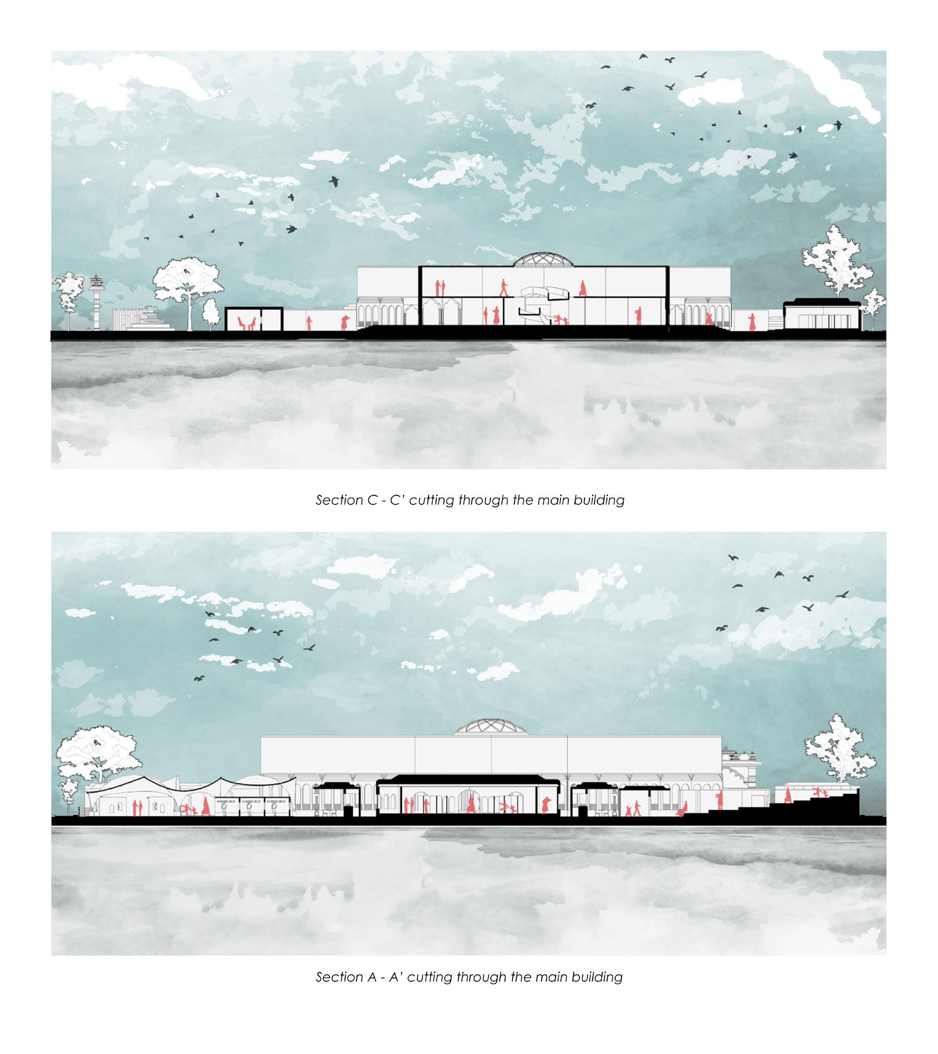 Above is a the ground floor plan of the whole design in where i’ve rendered it and as you can see the legend , there are many spaces provided for each particular purpose coming to the interpretation centre.