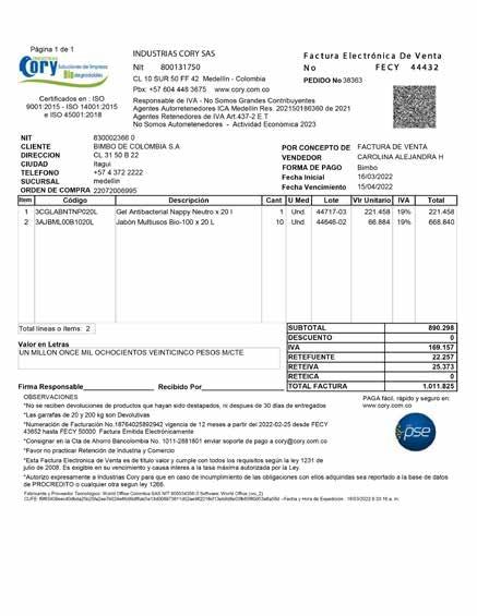 10 sur No. 50 FF-42 * Teléfono: 444 26 79 * Fax: 361 77 50 * E-mail: cory@cory.com.co * www.cory.com.co Medellín – Colombia