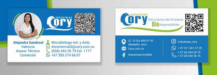 Las Tarjetas de presentación de los asesores tienen un tamaño de 5 cm x 9 cm. En policromía a dos caras. La información se debe organizar siguiendo los siguientes parámetros: Foto, logotipo, código QR, nombre y cargo, profesión, correo electronico, telefono y extención y número de celular Al respaldo el logotipo con información de la página web y redes sociales de Industrias Cory.
