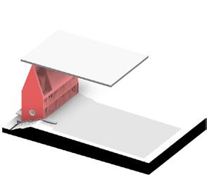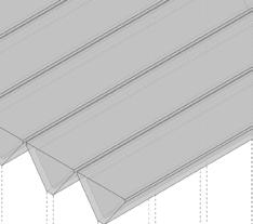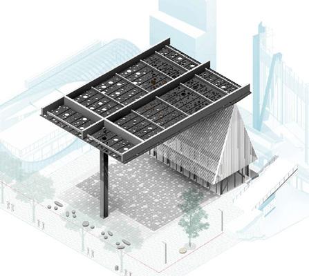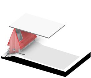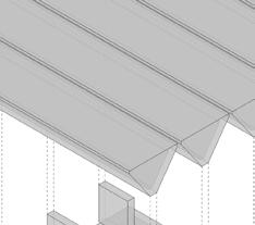 The pavilion is a trapezoid prism measuring 2.5 x 6.7m at its widest point. It is a portal frame where each frame forms the roof, flooring and walls. These structural elements work together and through compression, provide the overall structure of the pavilion. The height varies from 3 to 3.5m, rising up as the pavilion widens framing the view of the surrounding park. The pavilion is a free standing structure which will rest on a series of pad foundations and larch sleepers, intending minimise disruption to the parkland. Gaps between the timber slats to allow natural daylight and ventilation into the structure whilst the roof is solid to provide shelter.