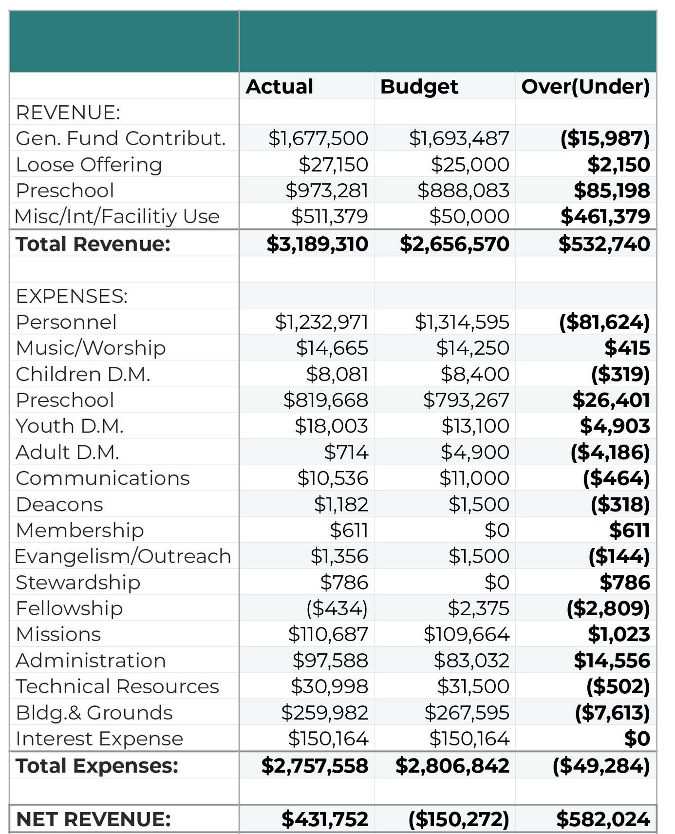 Loss of the Associate Pastor - The unexpected loss of our Associate Pastor had a profound impact on the Staff and congregation. The Personnel Committee partnered with church leadership to support staff members through this period and assistwithbusinessoperationsdecisions.