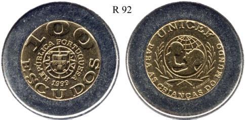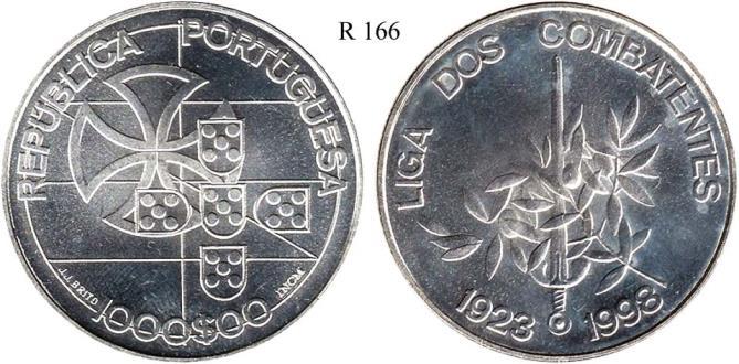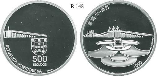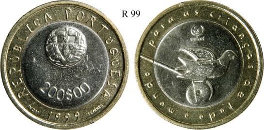 Pag. 86 REPÚBLICA D. MANUEL I 1 000$00 – Ag 500 Peso: 28,2 g Ø: 40 1998……Sob .….………………………..…. R165.01 LIGA DOS COMBATENTES 1 000$00 – Ag 500 Peso: 28,2 g Ø: 40 1998……Sob .… R166.01 1999 UNICEF 100$00 – BI-METÁLICA Peso: 8,3g Ø: 25 1999……Bela ..…….……………………………... R92.01 UNICEF 200$00 – BI-METÁLICA Peso: 9,8 g Ø: 28 1999……Bela ..…….……………………………... R99.01 MACAU 500$00 – Ag 500 Peso: 14 g Ø: 30 1999……Bela ….…………………………..…. R148.01 XXV ANOS DO 25 DE ABRIL 1 000$00 – Ag 500 Peso: 28,2 g Ø: 40 1999……Sob .….…………………………..…. R167.01 MILÉNIO DO ATLÂNTICO 1 000$00 – Ag 500 Peso: 28.2 g Ø: 40 1999……Sob .… R168.01