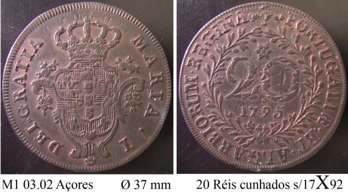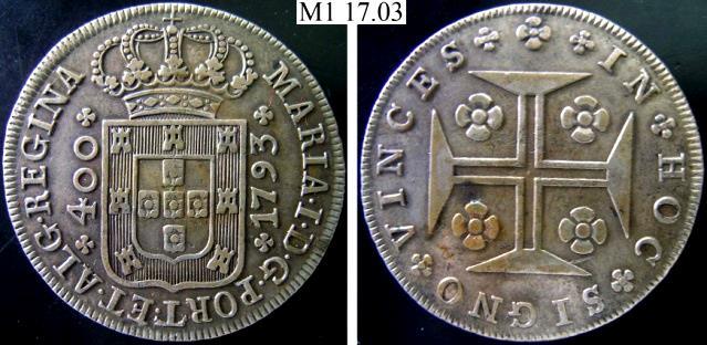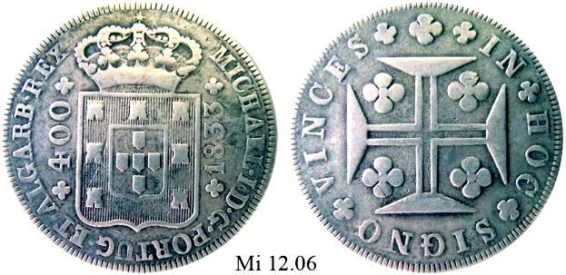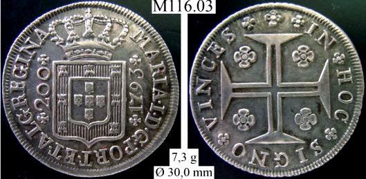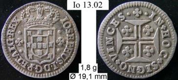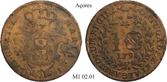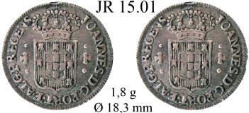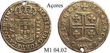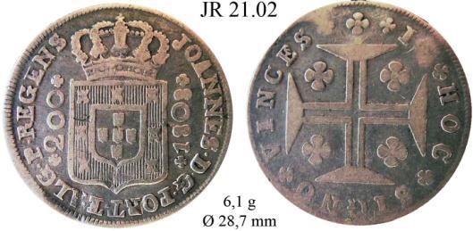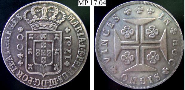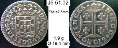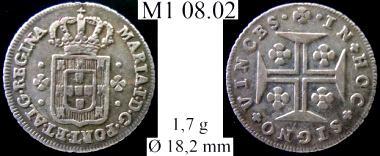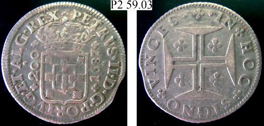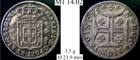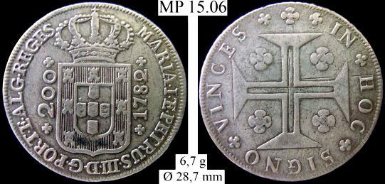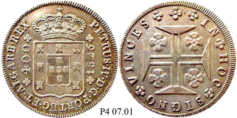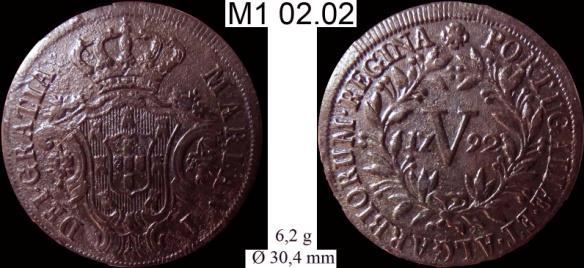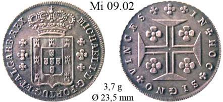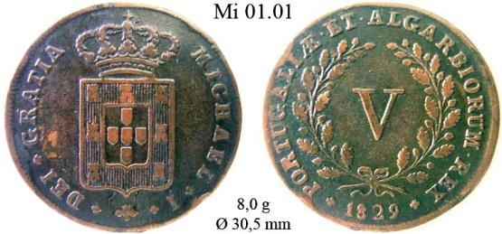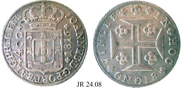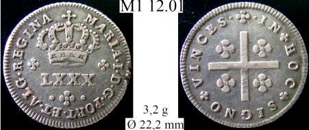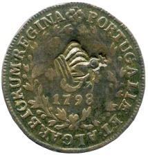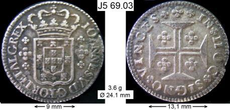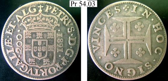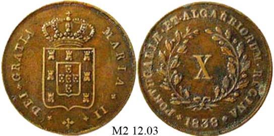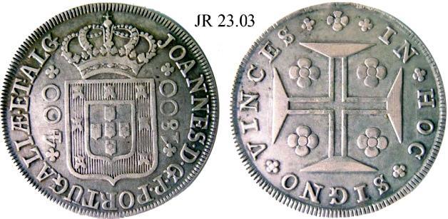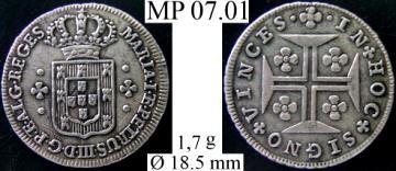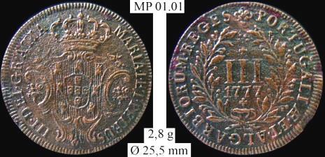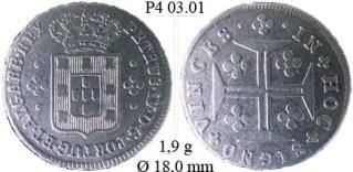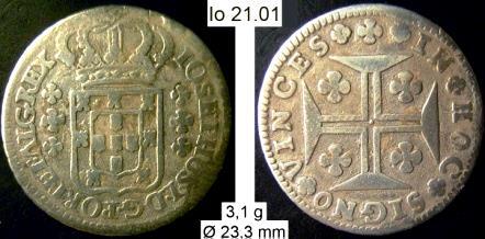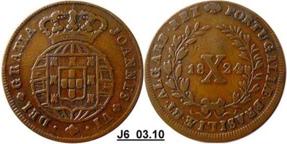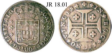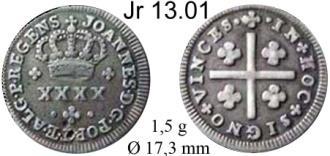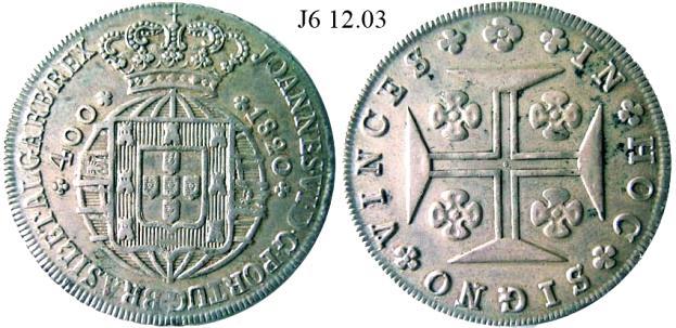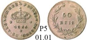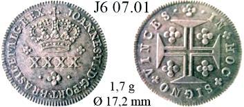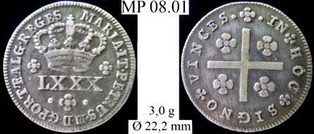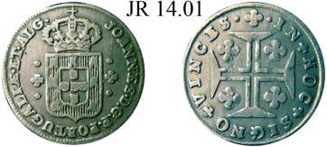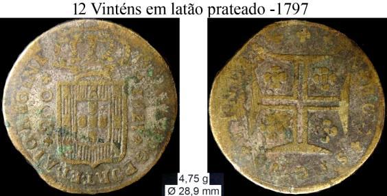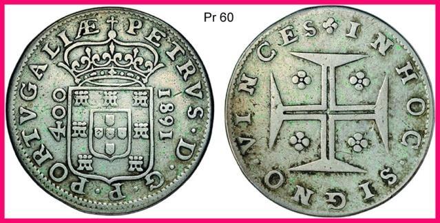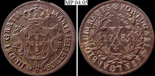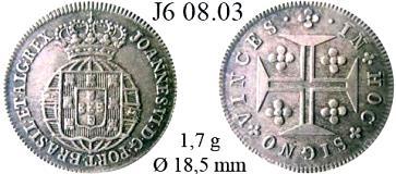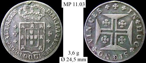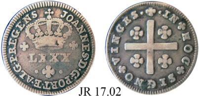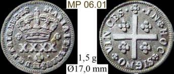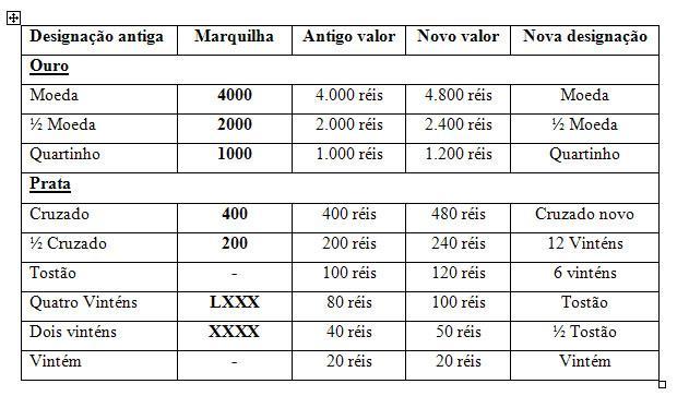 Cobre Real e Meio I ½ 1,5 Três Réis III 3 Cinco Réis V 5 Dez Réis X 10 Prata Vintém - 20 Meio Tostão XXXX 50 Três Vinténs - 60 Tostão LXXX 100 Seis Vinténs - 120 Doze Vinténs 200 240 Cruzado Novo 400 480