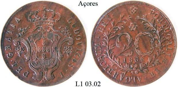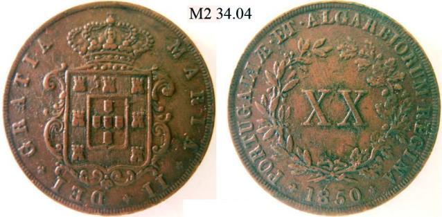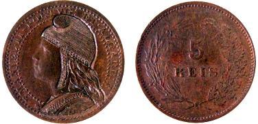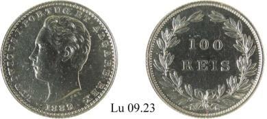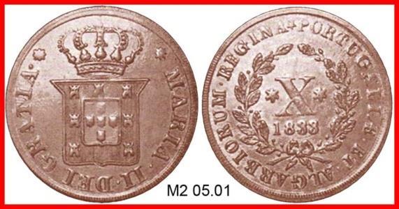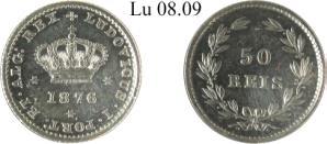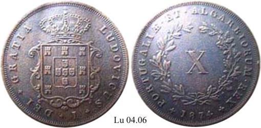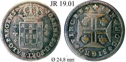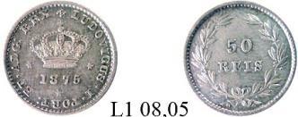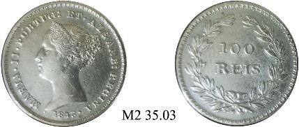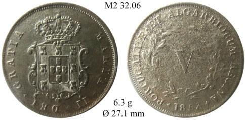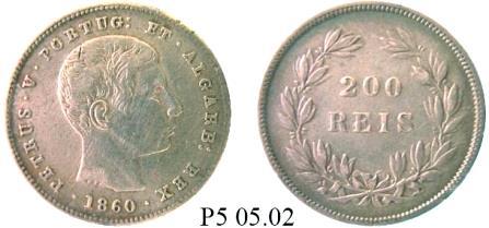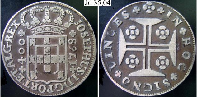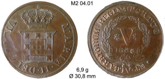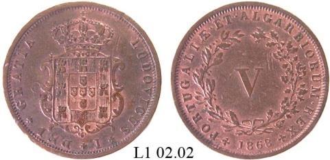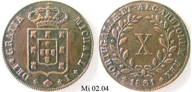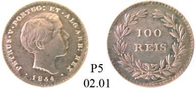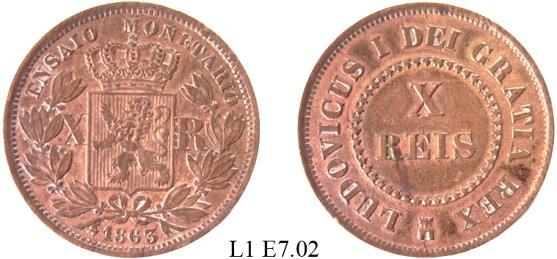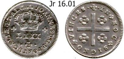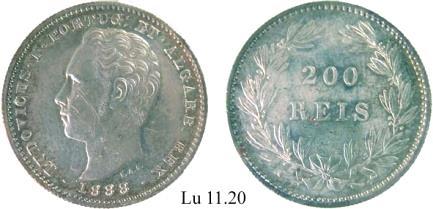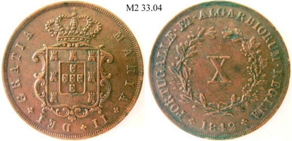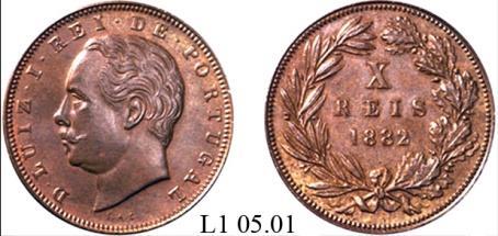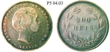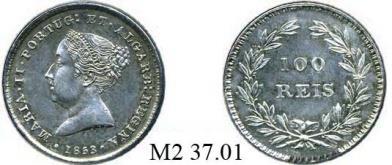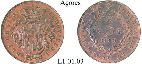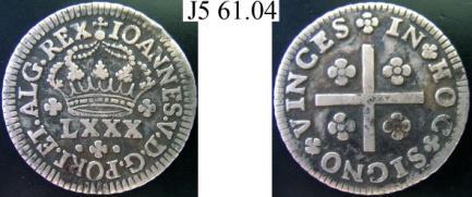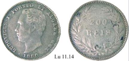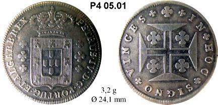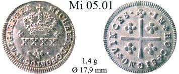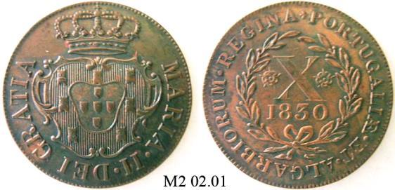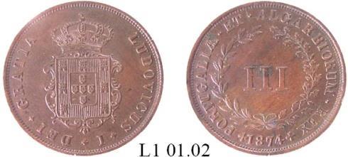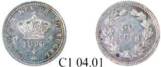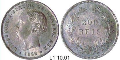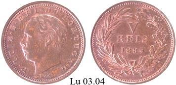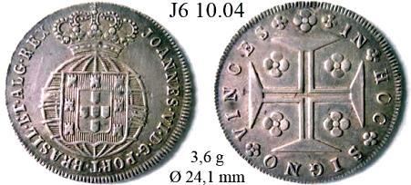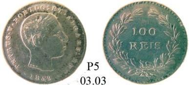 Cobre Real e Meio I½ 1,5 Três Réis III 3 Cinco Réis V 5 Dez Réis X 10 Prata Dois Vinténs XXXX 40 Meio Tostão - 50 Quatro Vinténs LXXX 80 Tostão - 100 Meio Cruzado 200 200 Cruzado 400 400