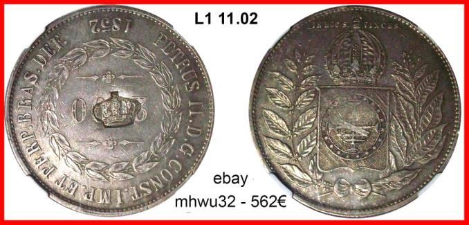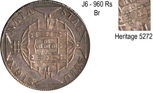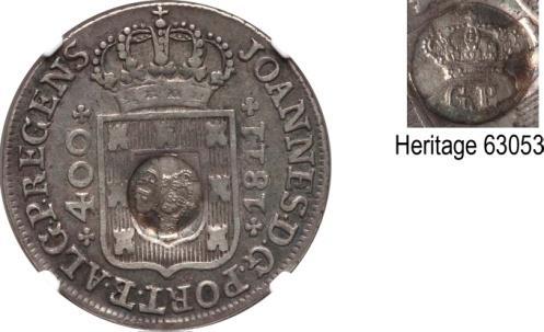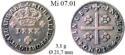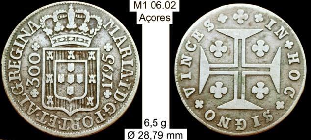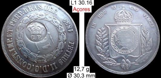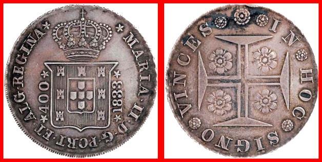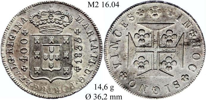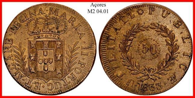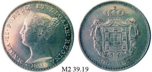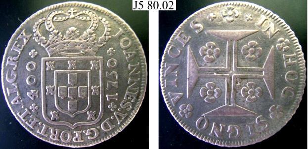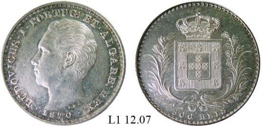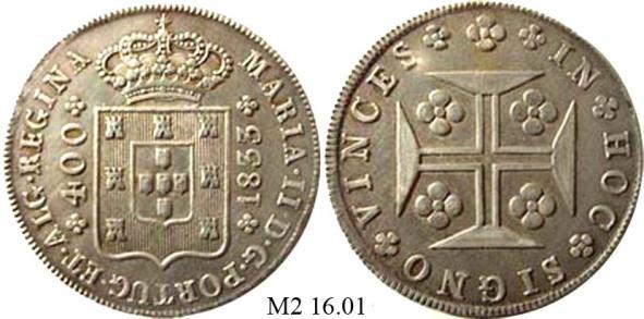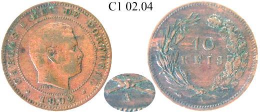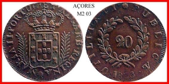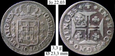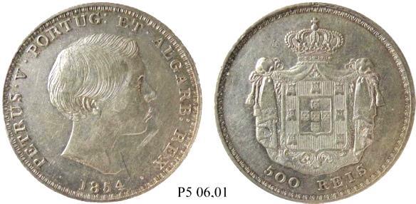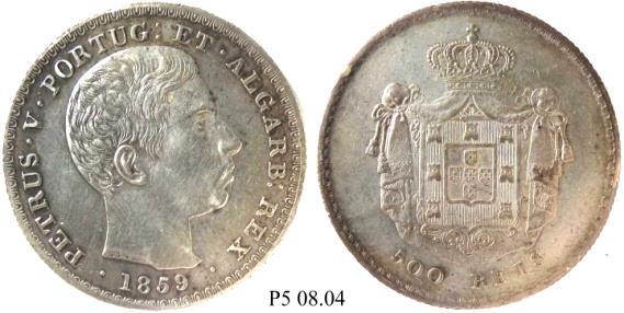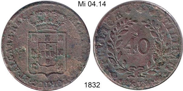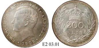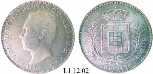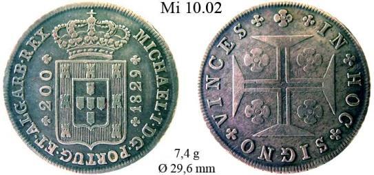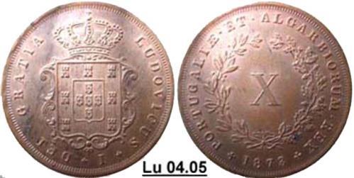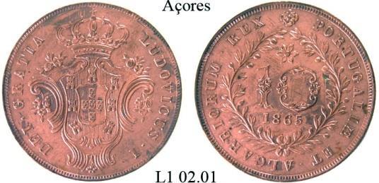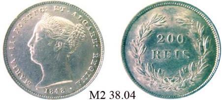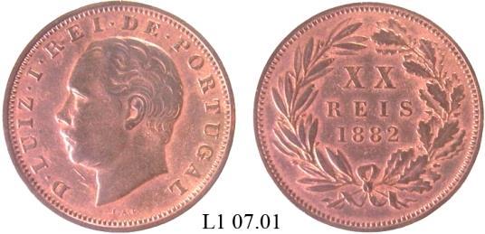 Cobre Real e Meio I½ 1,5 Três Réis III 3 Cinco Réis V 5 Dez Réis X 10 Prata Dois Vinténs XXXX 40 Meio Tostão - 50 Quatro Vinténs LXXX 80 Tostão - 100 Meio Cruzado 200 200 Cruzado 400 400