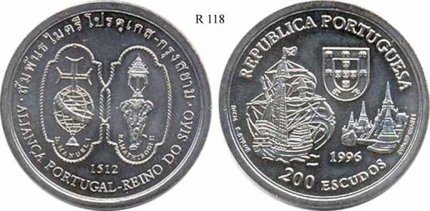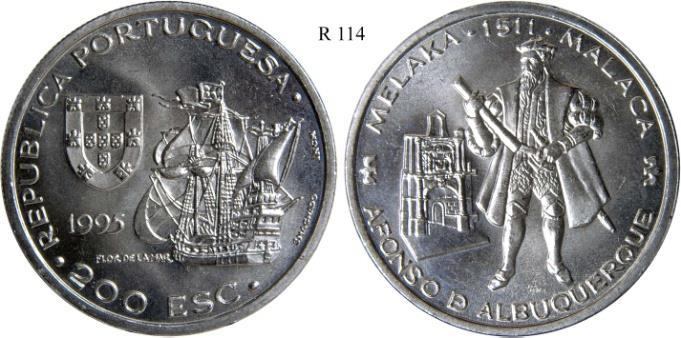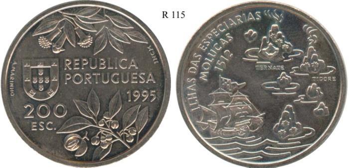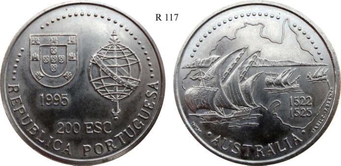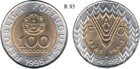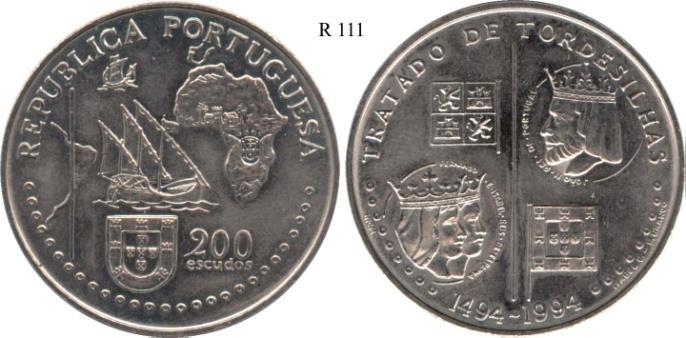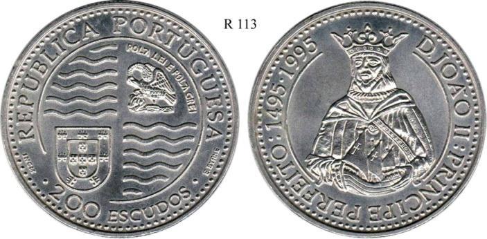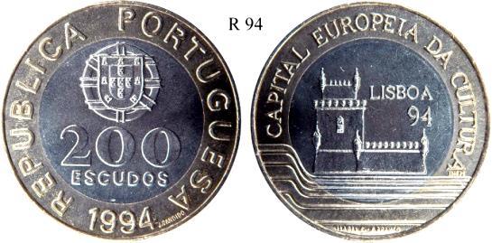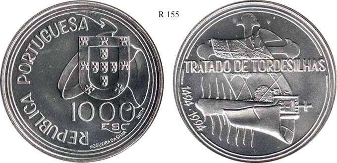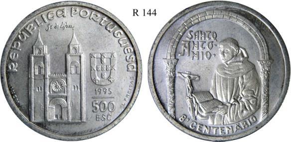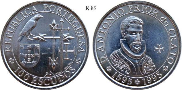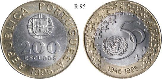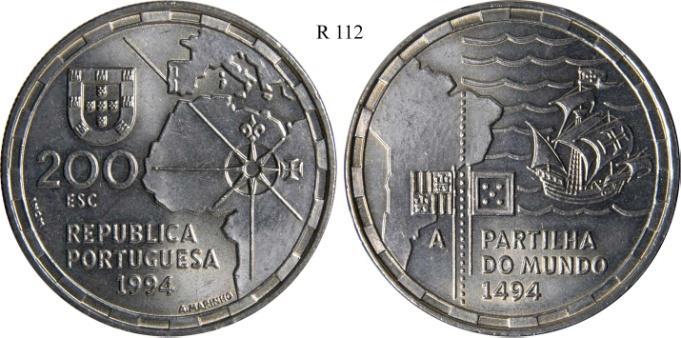 Pag. 83 REPÚBLICA 1994 CAPITAL EUROPEIA 200$00 – BI-METÁLICA Peso: 9,8 g Ø: 28 1994……Bela ..…….……………………………... R94.01 TRATADO DE TORDESILHAS 1.000$00 – Ag 500 Peso: 28,2 g Ø: 40 1994……Sob …..………………..…………..…. R155.01 D. JOÃO II 1.000$00 – Ag 500 Peso: 28,2 g Ø: 40 1994……Sob ..……………..……………..… R157.01 1995 50º ANIVERSÁRIO F.A.O. 100$00 – BIMETÁLICA Peso: 8,0 g Ø: 25 1995……BNC ……..…….……………………… R85.02 1995……PROOF…..…….………………………… R85.03 AUTONOMIA DOS AÇORES 100$00 – CUPRO-NÍQUEL Peso: 15 g Ø: 33 1995……Bela ..…….……………………………... R90.01 D.ANTÓNIO, PRIOR DO CRATO 100$00 – CUPRO-NÍQUEL Peso: 15 g Ø: 33 1995……Sob …..…….………………………… R89.01 50º ANIV. O.N.U. 200$00 – BI-METÁLICA Peso: 9,8 g Ø: 28 1995……BNC ..…….……………………………... R95.02 1995……PROOF …. R95.03